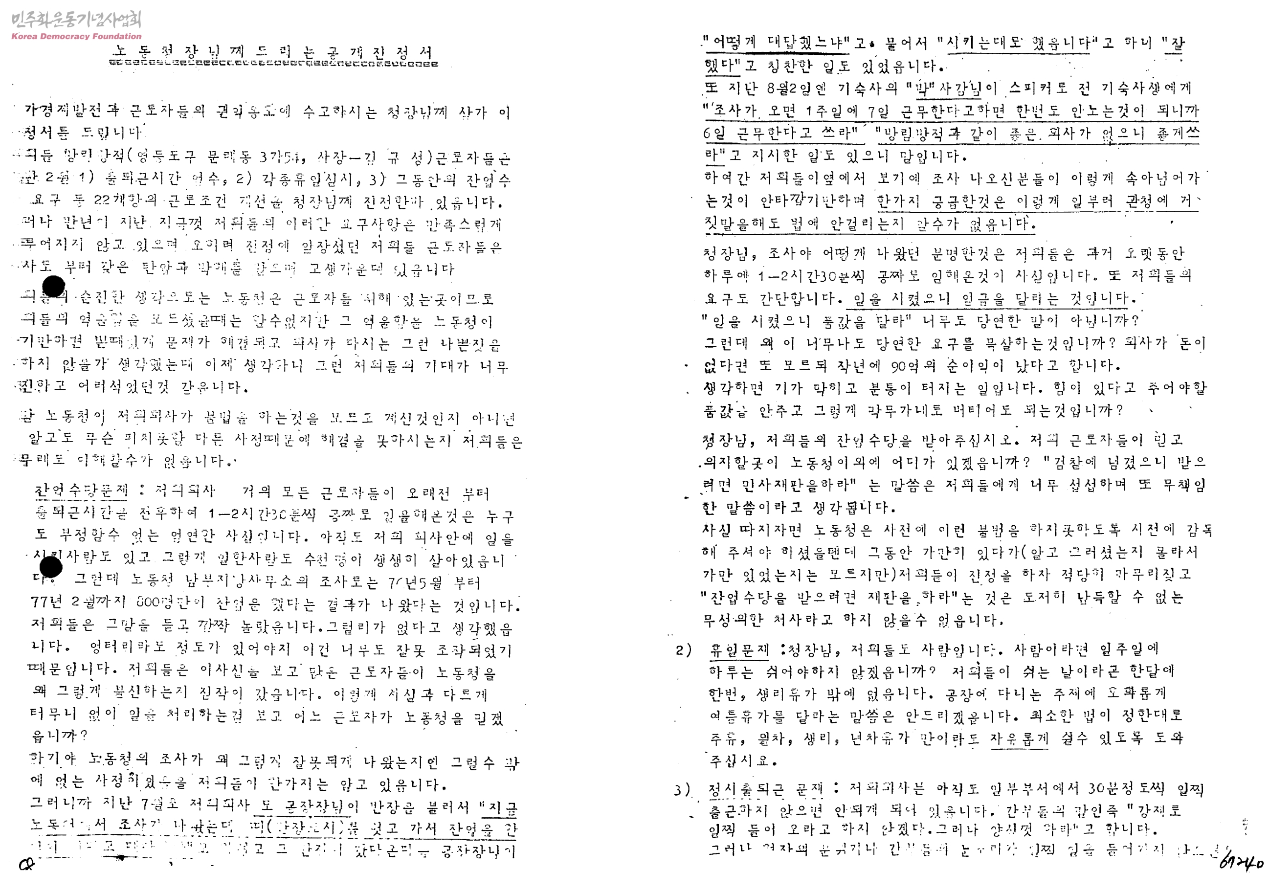 노동청장님께 드리는 공개진정서[방림방적근로자들의 근로조건 개선에 대한 진정서]