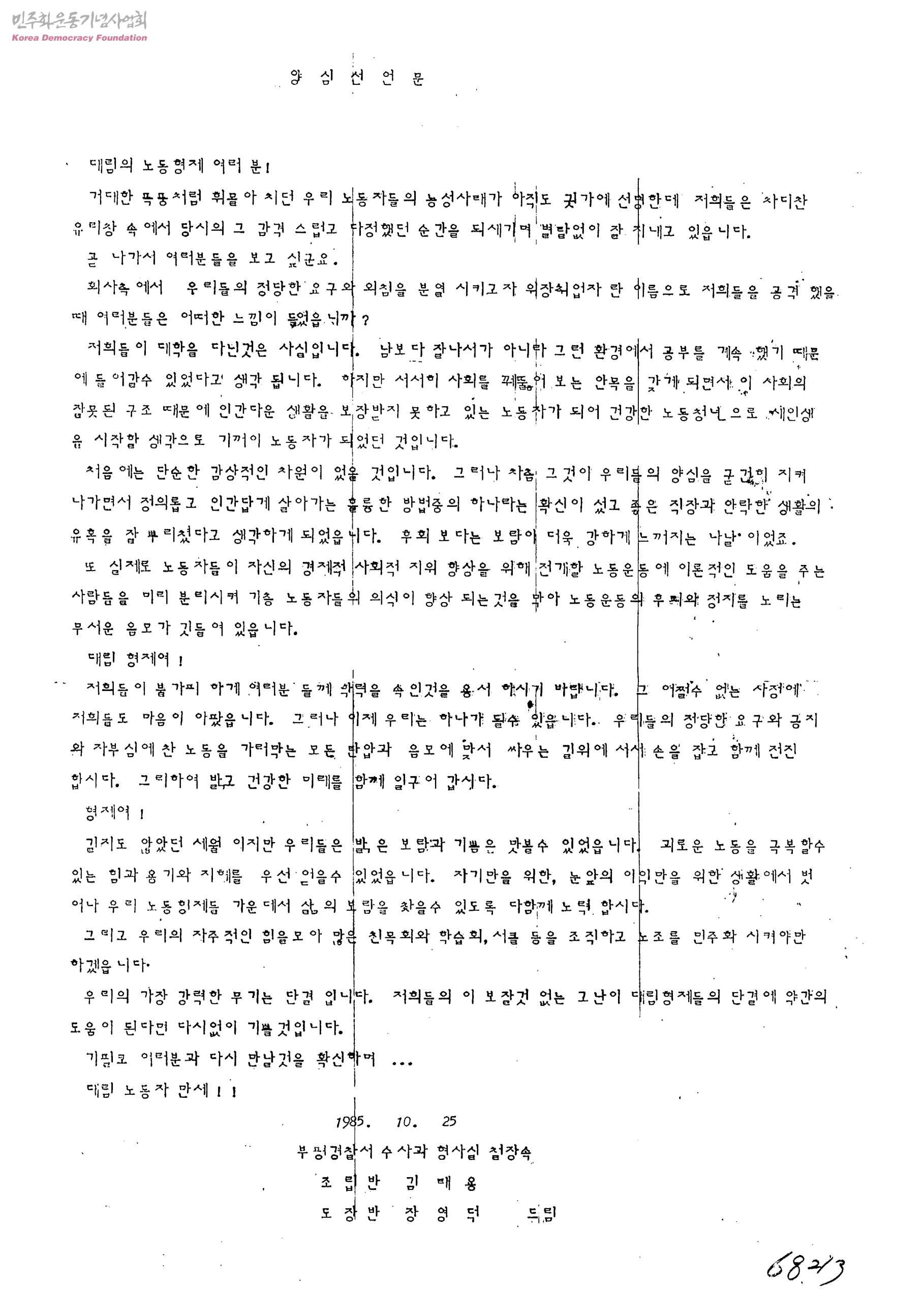 양심선언문[위장취업중 구속된 노동자가 대림노동자들에게 보내는 편지]