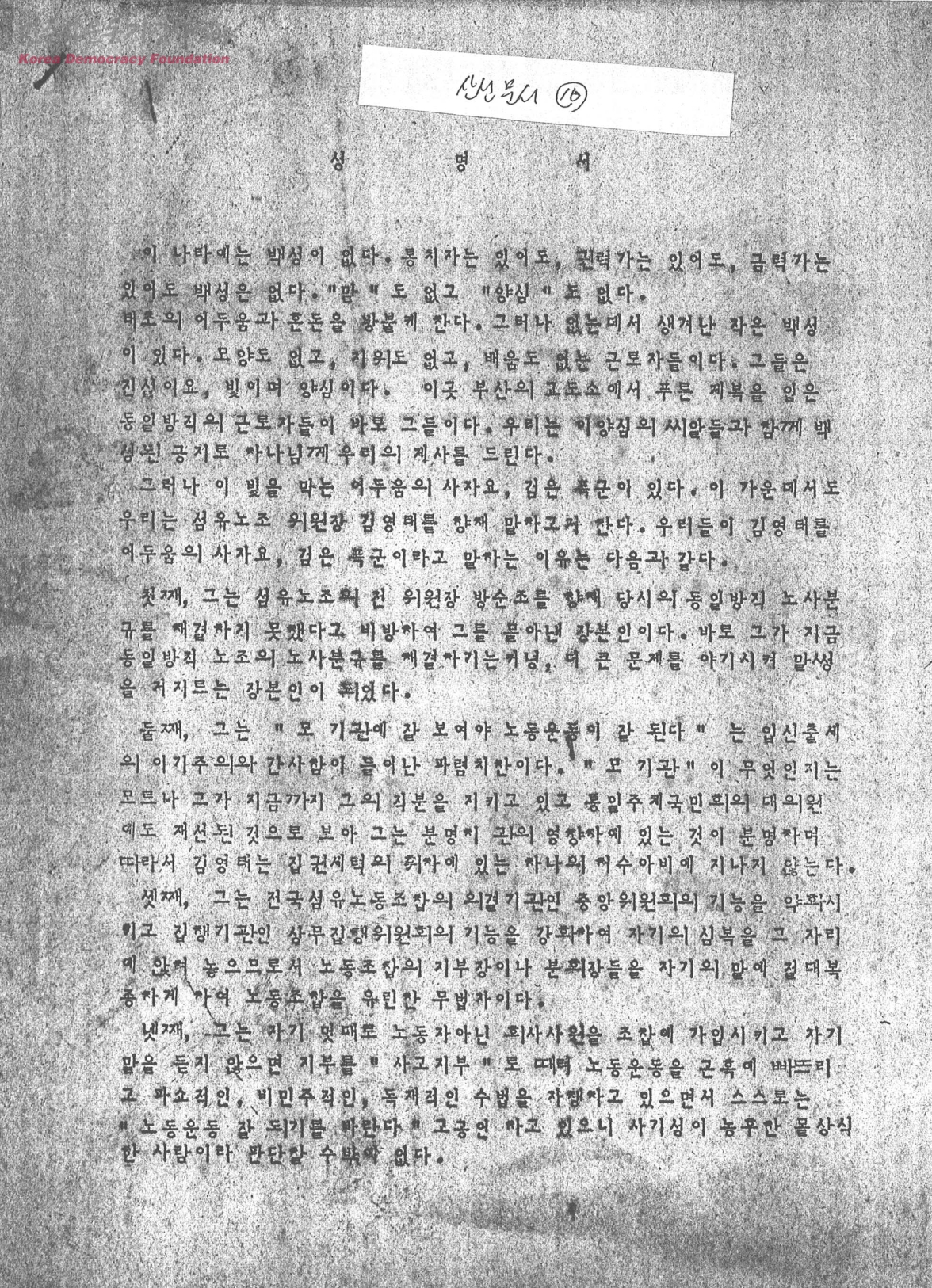 성명서[동일방직 근로자 해고와 관련하여 섬유노조위원장 김영태에게 촉구한다]
