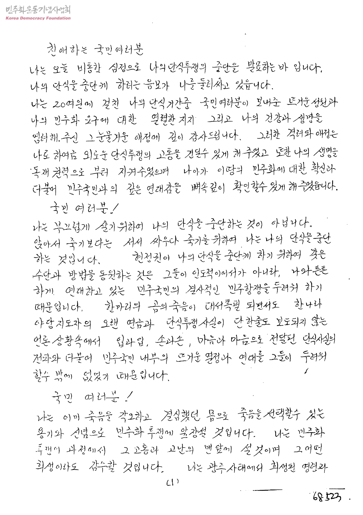 [나의 단식투쟁의 중단을 발표]