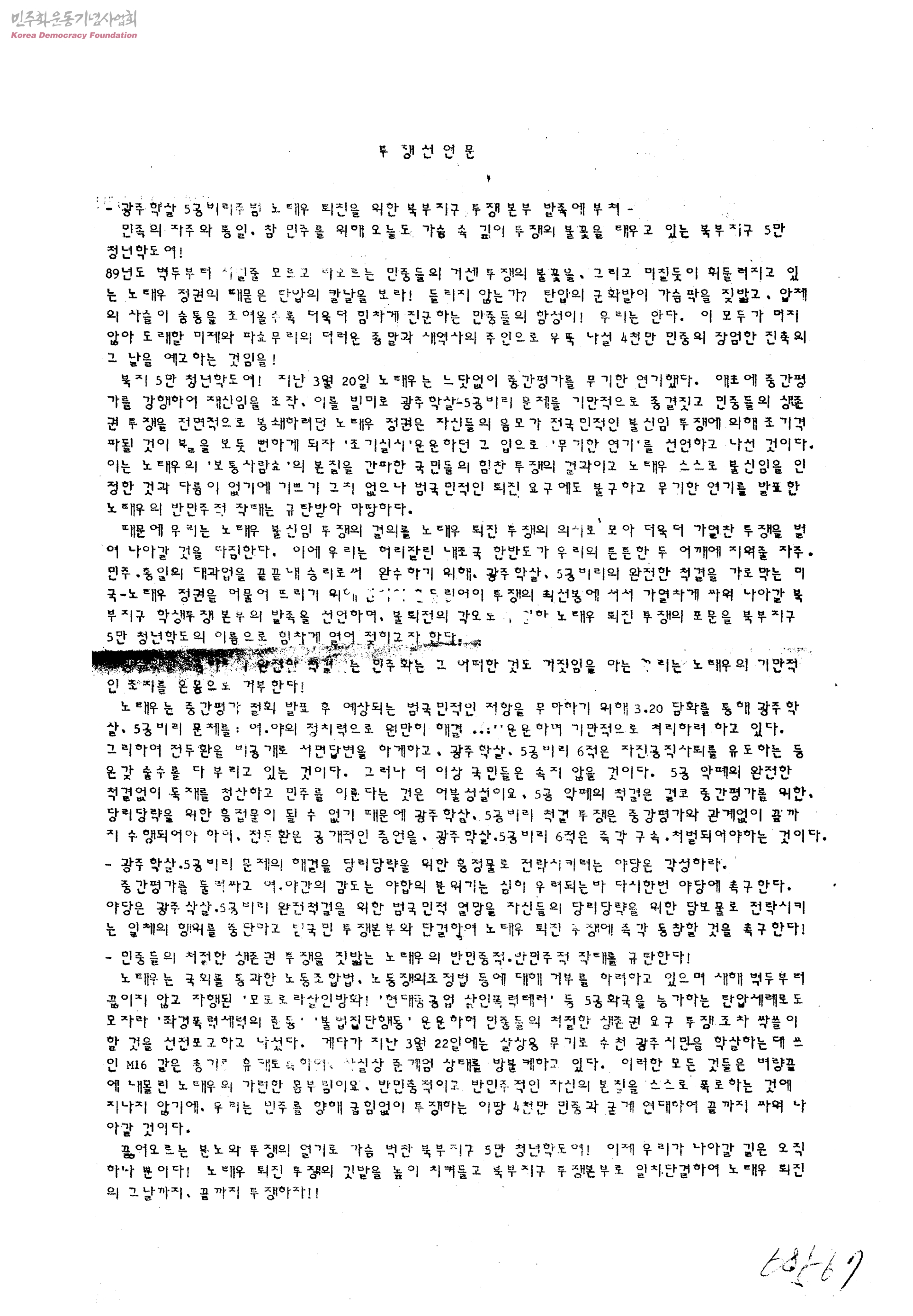 투쟁선언문-광주 학살 5공비리주범 노태우 퇴진을 위한 북부지구 투쟁본부 발족에 부쳐