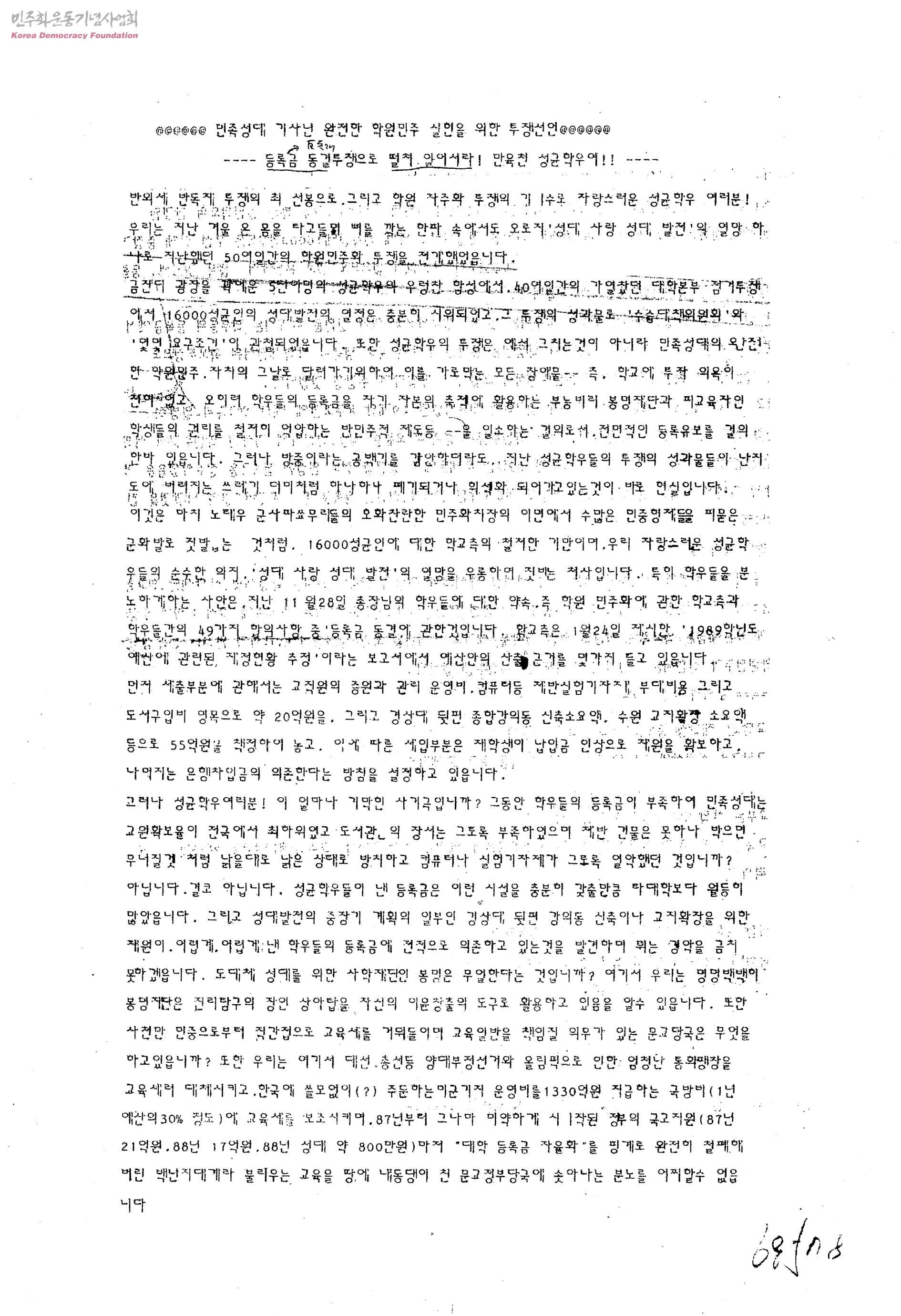 민족성대 기사년 완전한 학원민주 실현을 위한 투쟁선언-등록금 동결투쟁으로 펄쳐 일어서라! 만육천 성균학우여!!