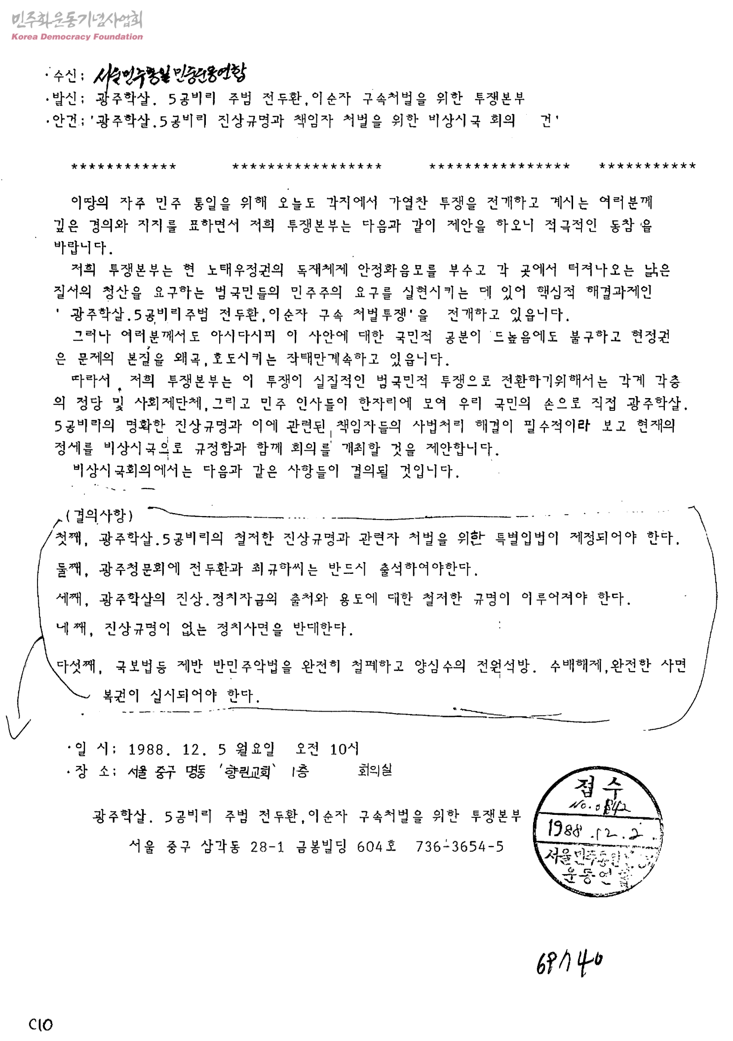 광주학살.5공비리 진상규명과 책임자 처벌을 위한 비상시국 회의 건[수신:서울민주통일민중운동연합, 발신:광주학살.5공비리 주범 전두환, 이순자 구속처벌을 위한 투쟁본부]