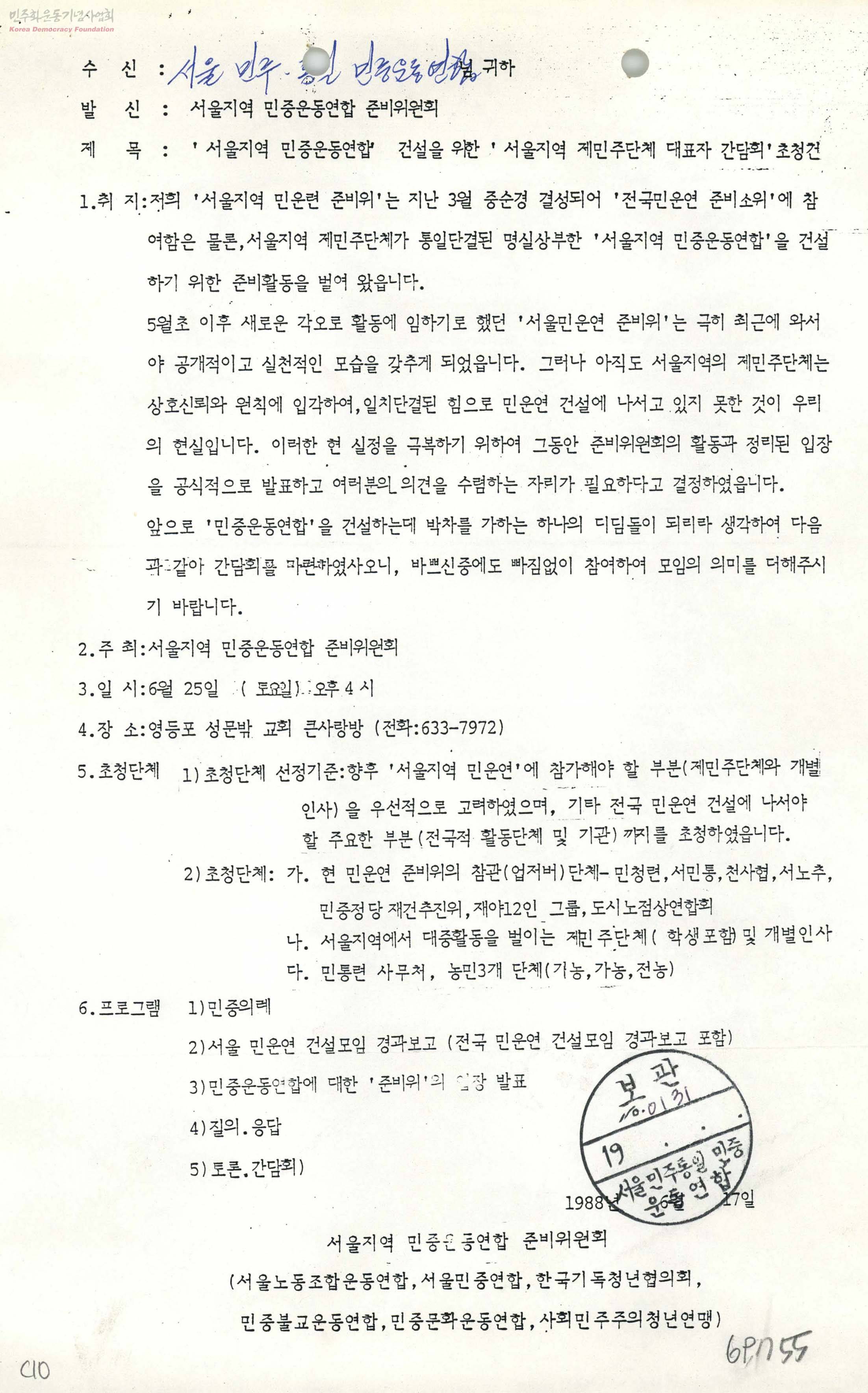 서울지역 민중운동연합 건설을 위한 서울지역 제민주단체 대표자 간담회 초청건