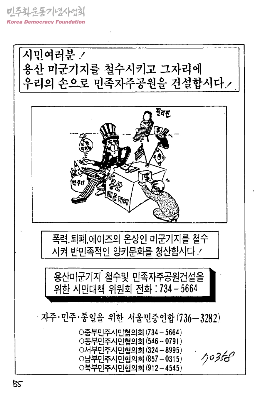 시민여러분! 용산 미군기지를 철수시키고 그자리에 우리의 손으로 민족자주공원을 건설합시다