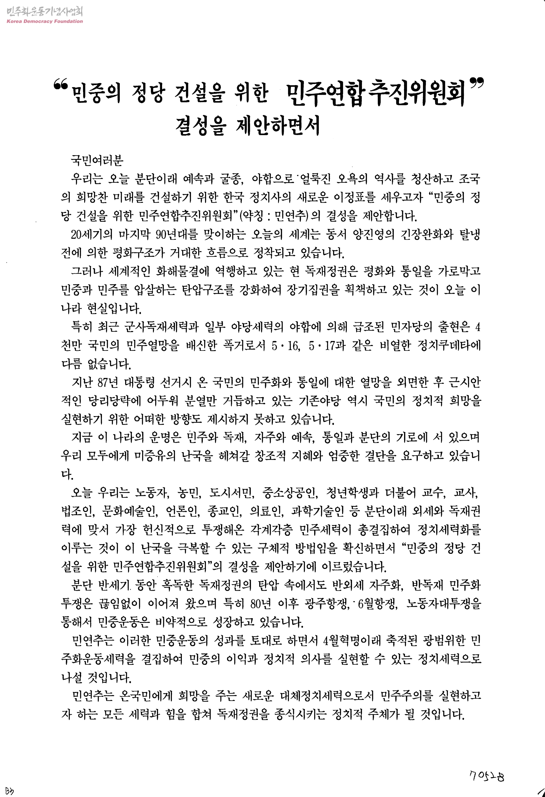 '민중의 정당 건설을 위한 민주연합추진위원회' 결성을 제안하면서