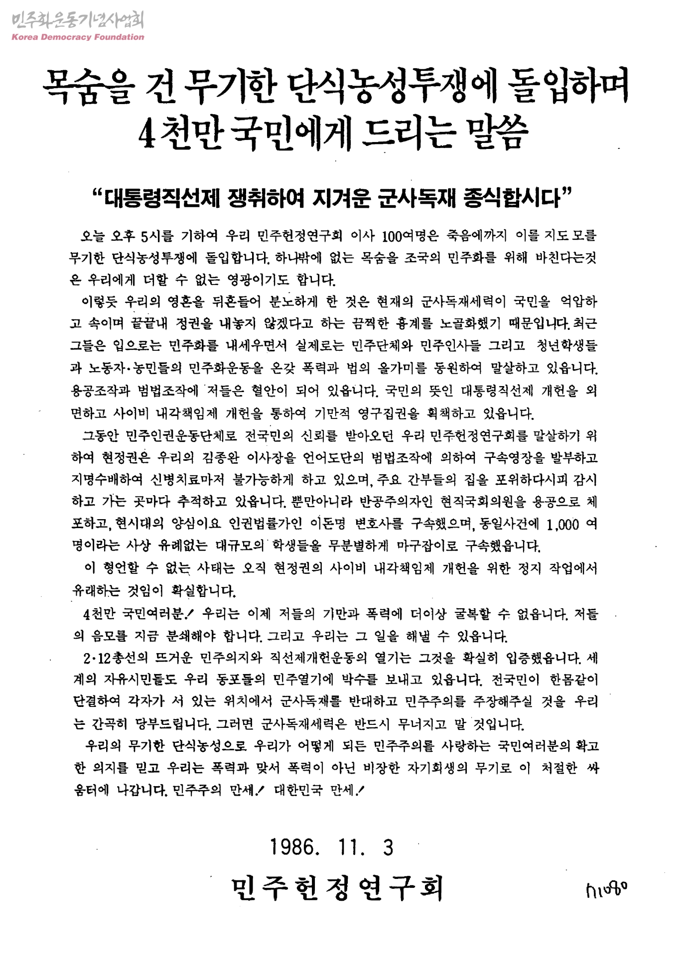 목숨을 건 무기한 단식농성투쟁에 돌입하며 4천만 국민에게 드리는 말씀-대통령직선제 쟁취하여 지겨운 군사독재 종식합시다