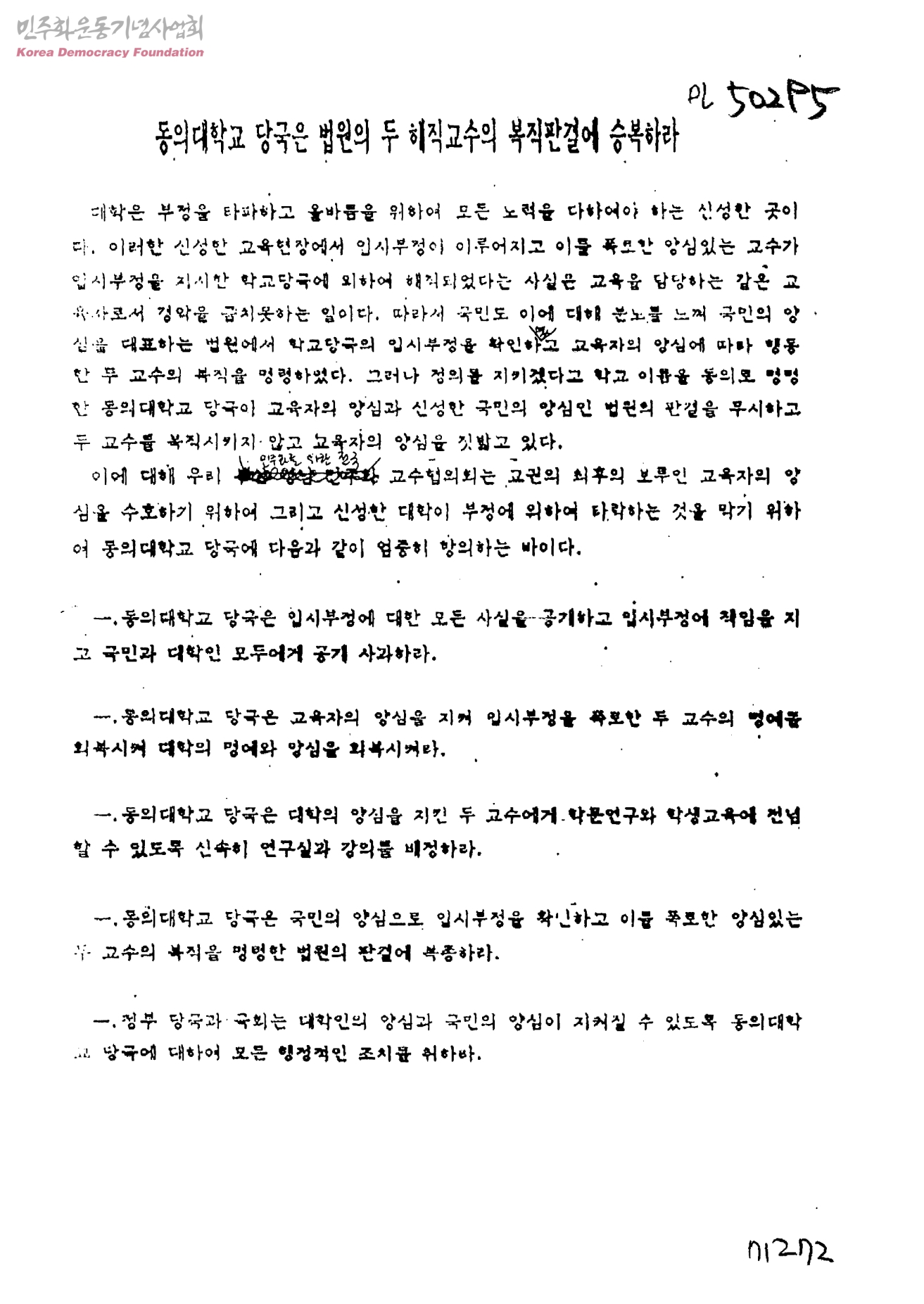 동의대학교 당국은 법원의 두 해직교수의 복직판결에 승복하라