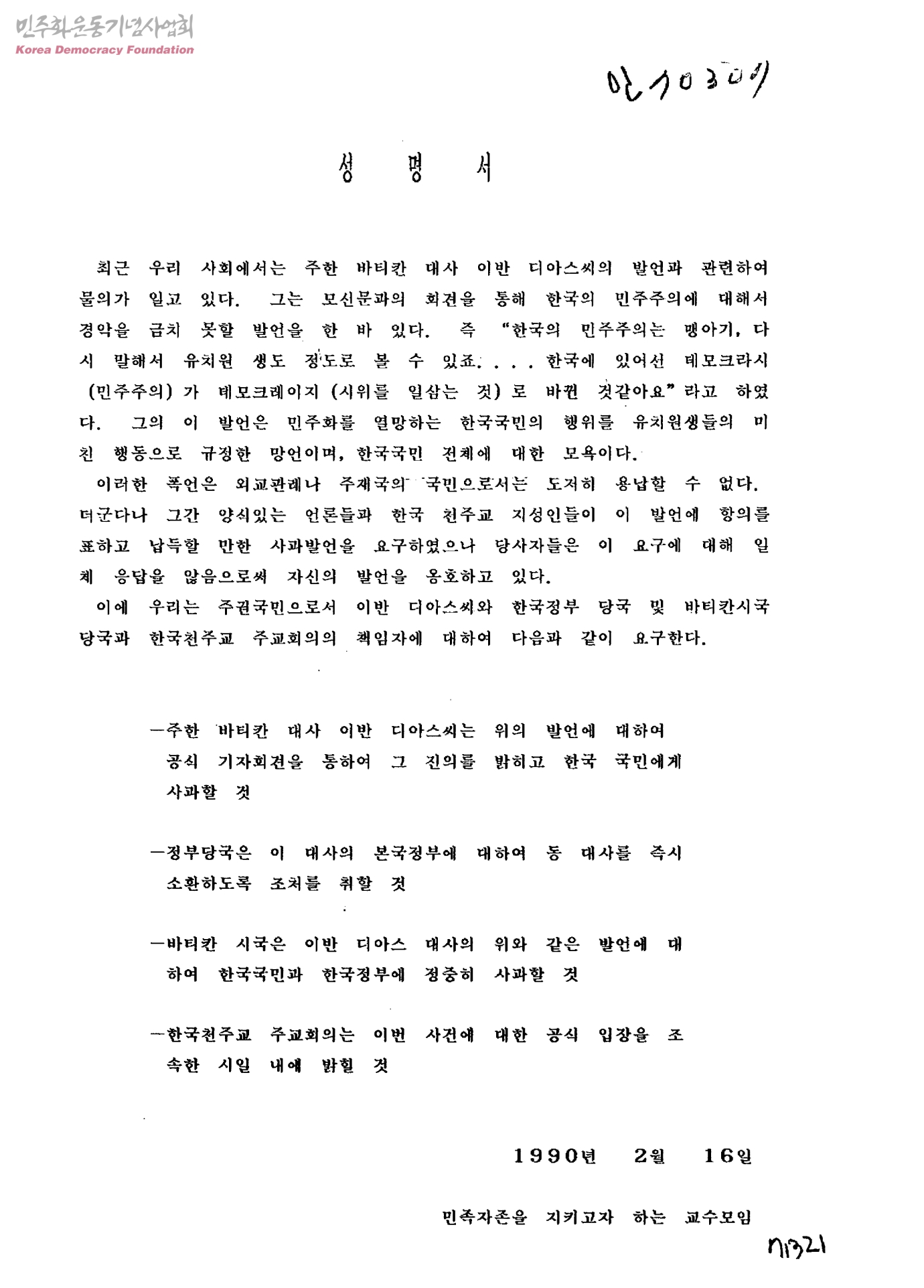 성명서[주한 바티칸 대사의 발언에 대한성명서]
