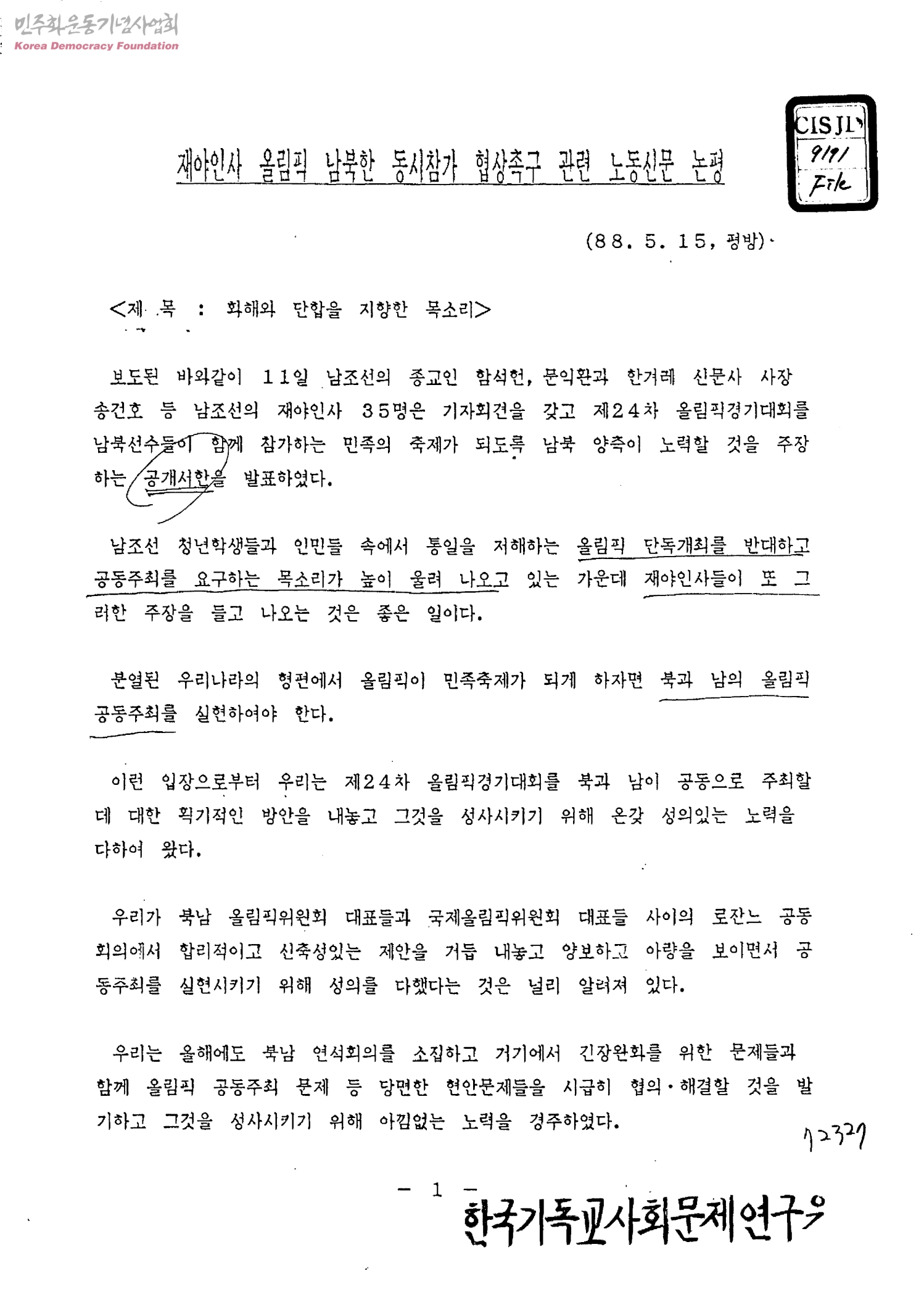 재야인사 올림픽 남북한 동시참가 협상촉구 관련 노동신문 논평