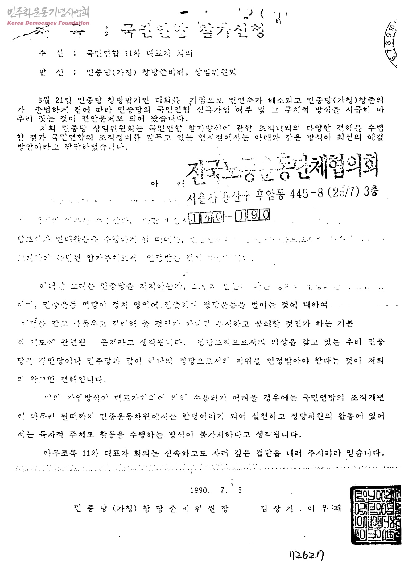 국민연합 참가신청[수신:국민연합 11차 대표자회의, 발신:민중당(가칭) 창당준비위, 상임위원회]