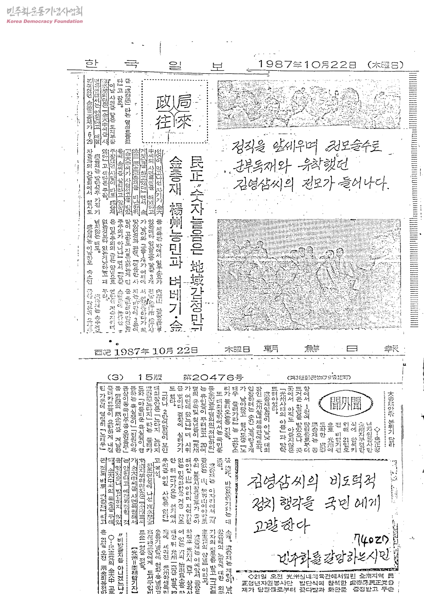 [신문스크랩]정직을 앞세우며 권모술수로 군부독재와 유착했던 김영삼씨의 전모가 들어나다
