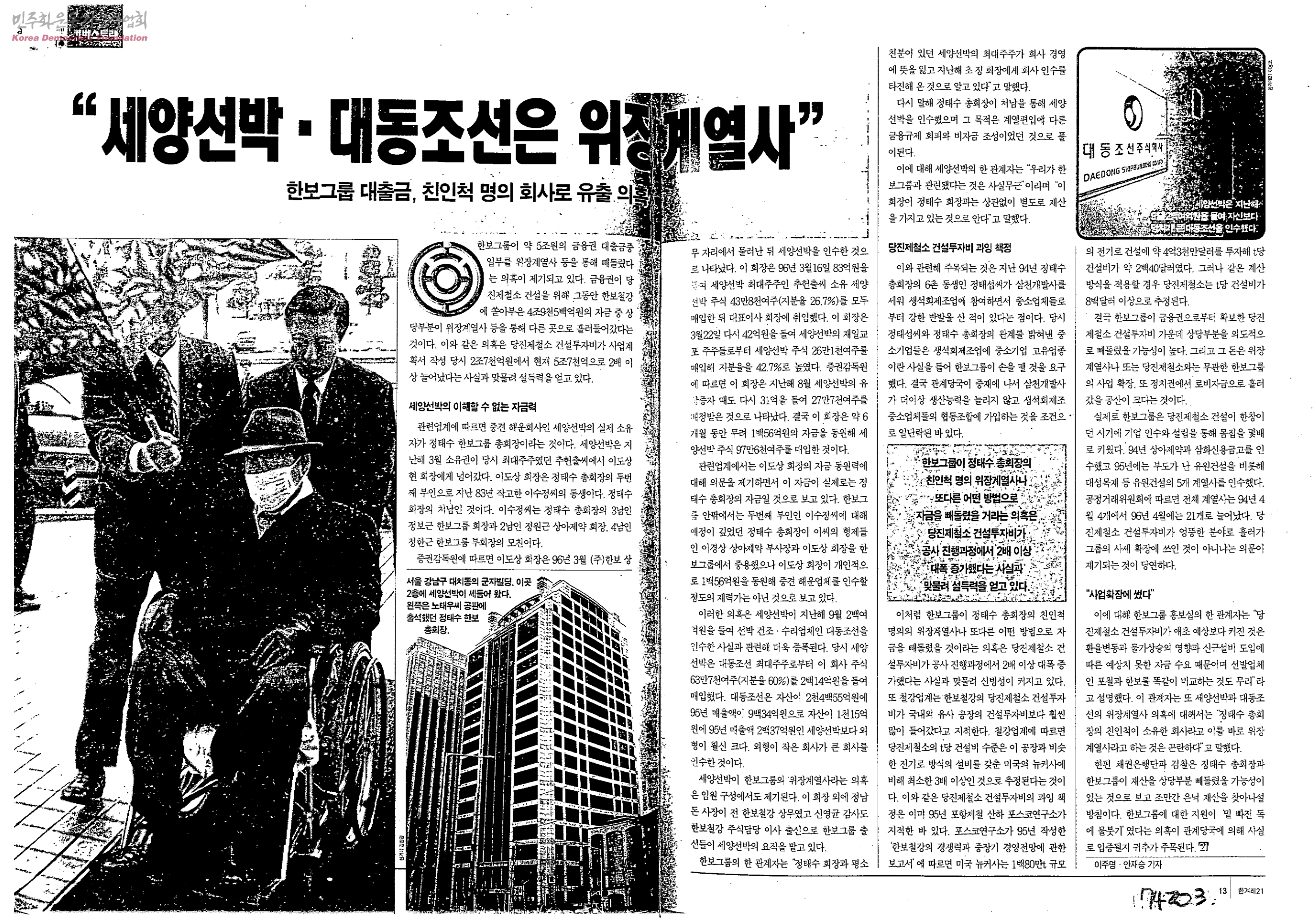 세양선박·대동조선은 위장계열사[한보그룹 사태관련 기사]