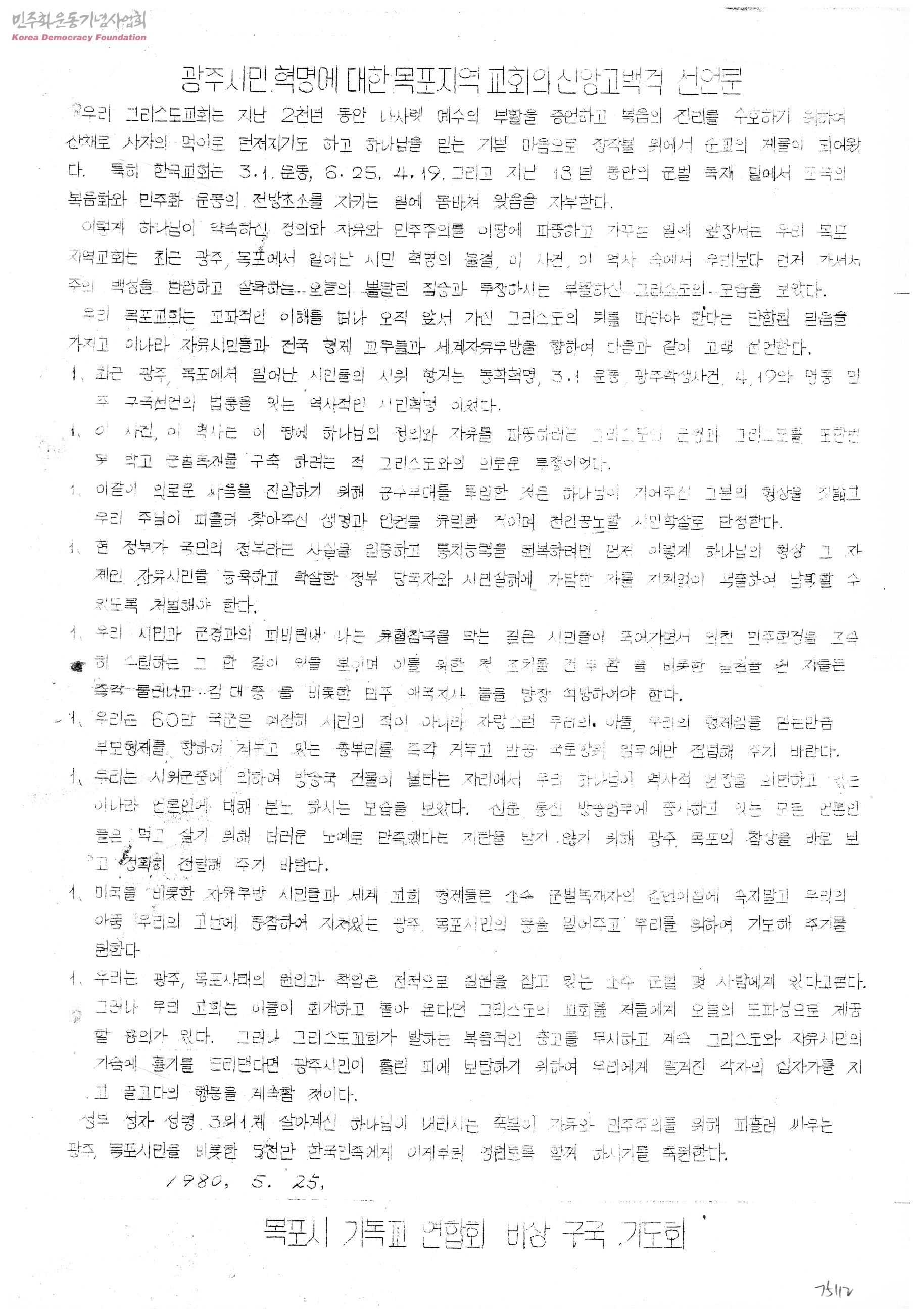 광주시민혁명에 대한 목포지역 교회의 신앙고백전 선언문