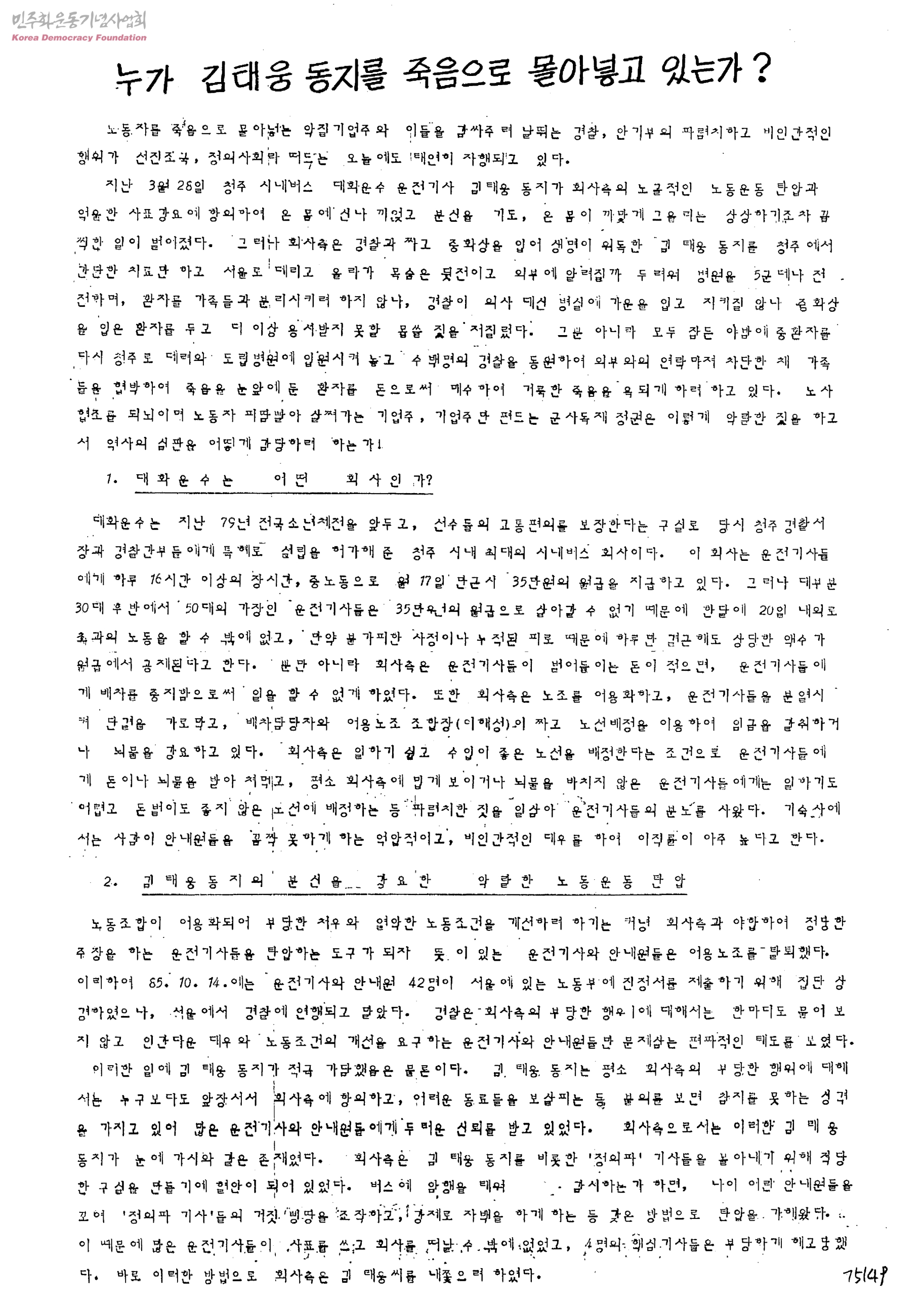 누가 김태웅 동지를 죽음으로 몰아넣고 있는가