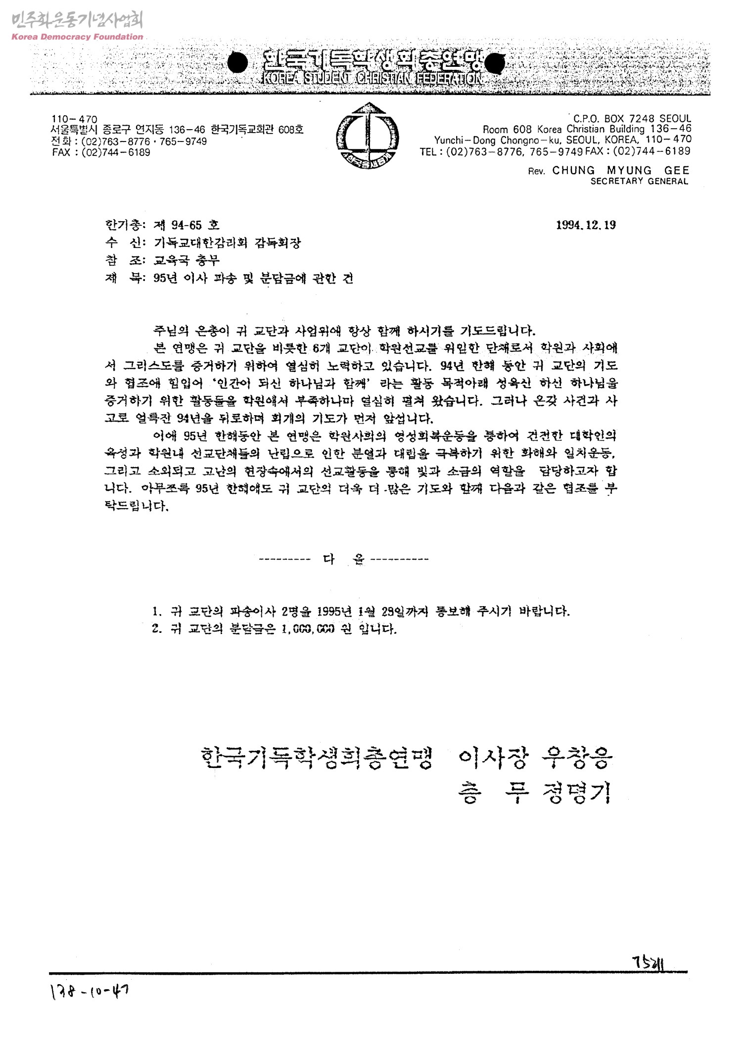95년 이사 파송 및 분담금에 관한 건[수신:기독교대한감리회 감독회장]