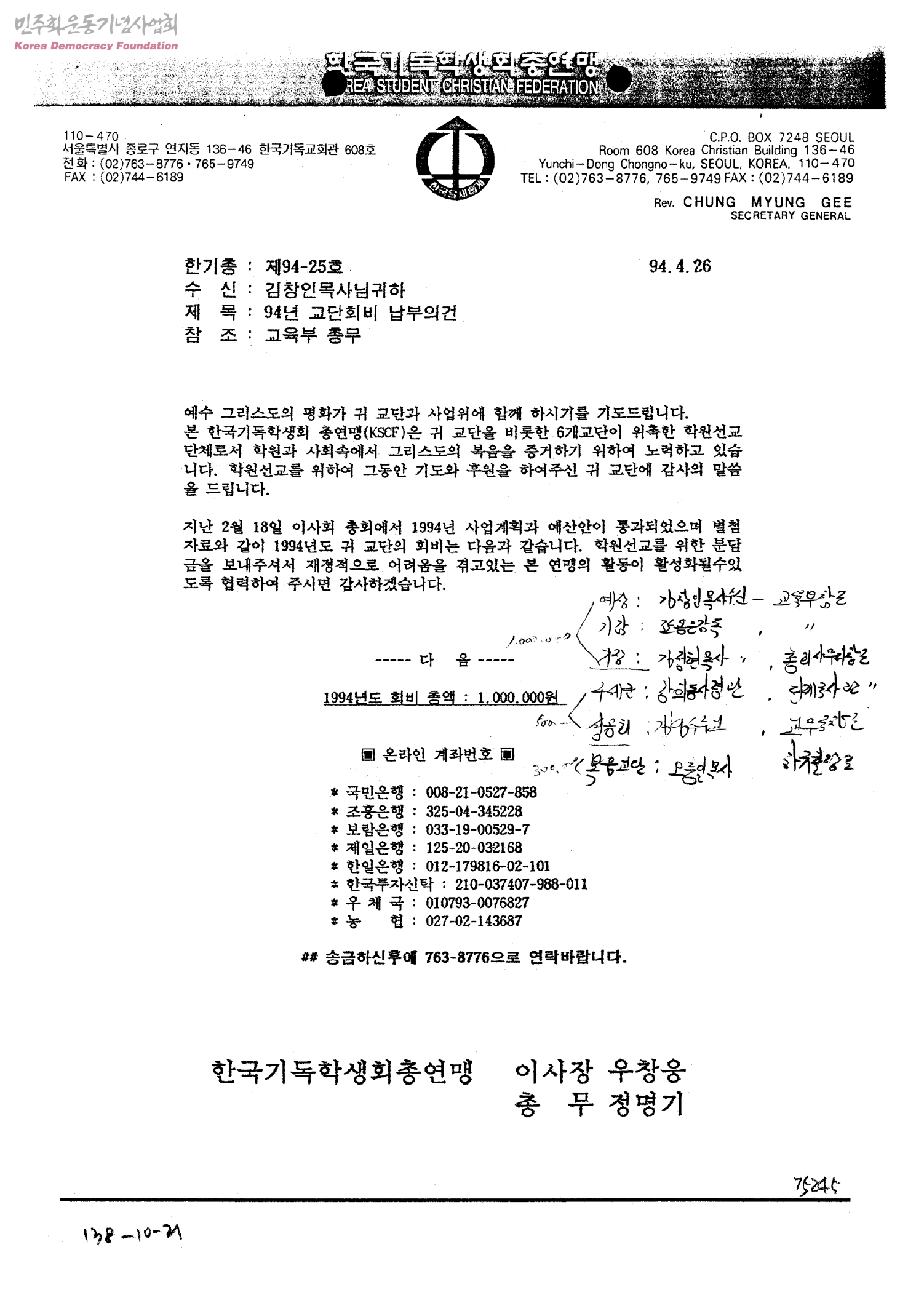 94년 교단회비 납부의건[수신:김창인목사님]