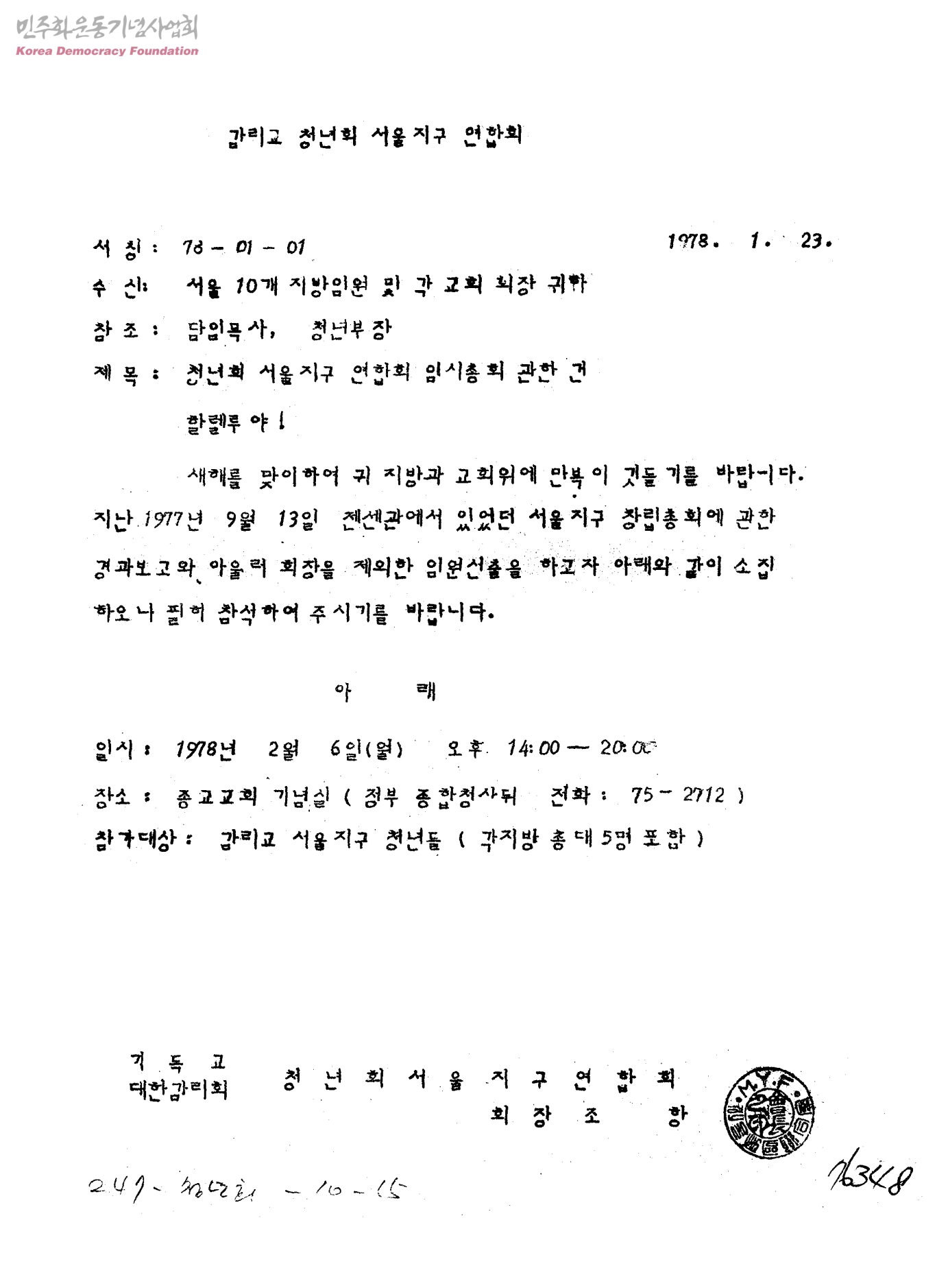 청년회 서울지구 연합회 임시총회 관한 건[수신:서울 10개 지방임원 및 각 교회 회장 귀하]
