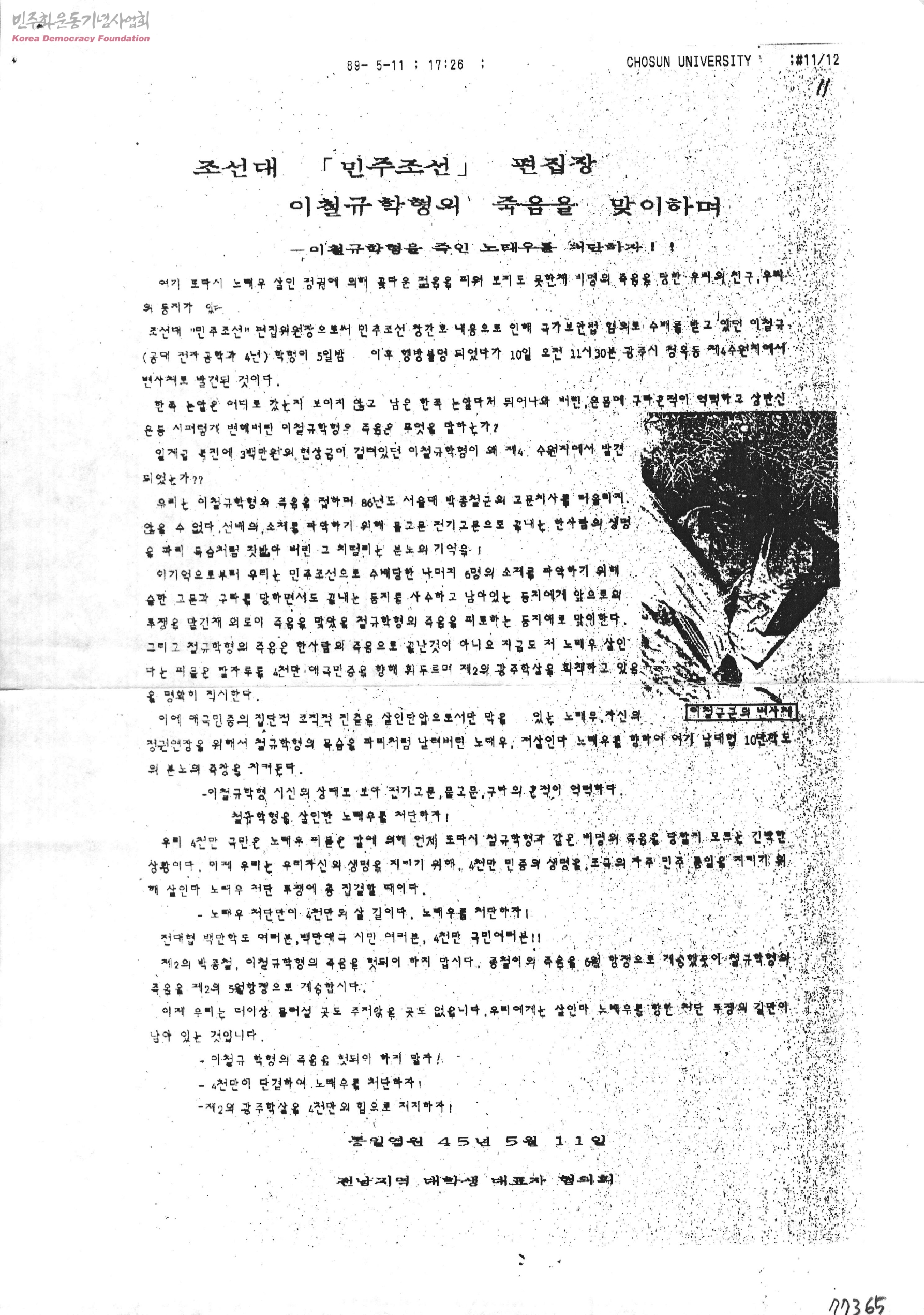 조선대「민주조선」편집장 이철규학형의 죽음을 맞이하며-이철규학형을 죽인 노태우를 처단하자!!