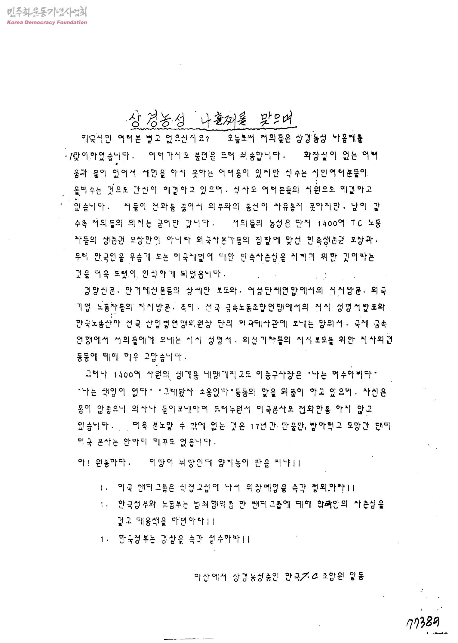 - 생산자 및 기증자가 ‘박용수’인 사진의 사용은 구매신청을 클릭하여 직접 사진 구매 신청을 하실 수 있습니다. 생산자 및 기증자가 ‘경향신문사’인 사진의 사용은 경향신문사 담당자(02-3701-1635)를 통해 구매하실 수 있습니다. 그 외의 생산자 및 기증자는 민주화운동기념사업회 사료관 담당자( hyunchaek@kdemo.or.kr / 02-6440-8961 )에 문의바랍니다.