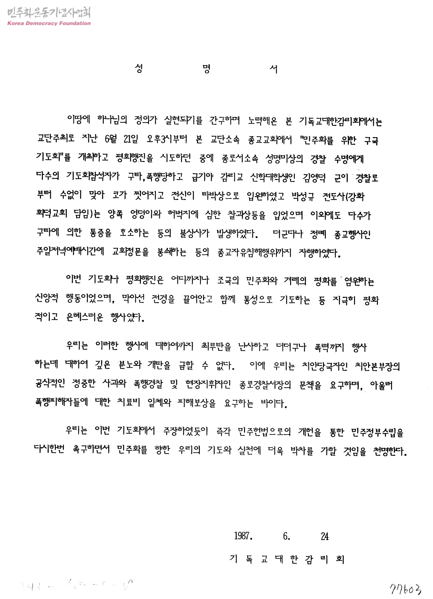 성명서["민주화를 위한 구국기도회&평화행진"참가자들의 경찰에 의한 폭행사건]