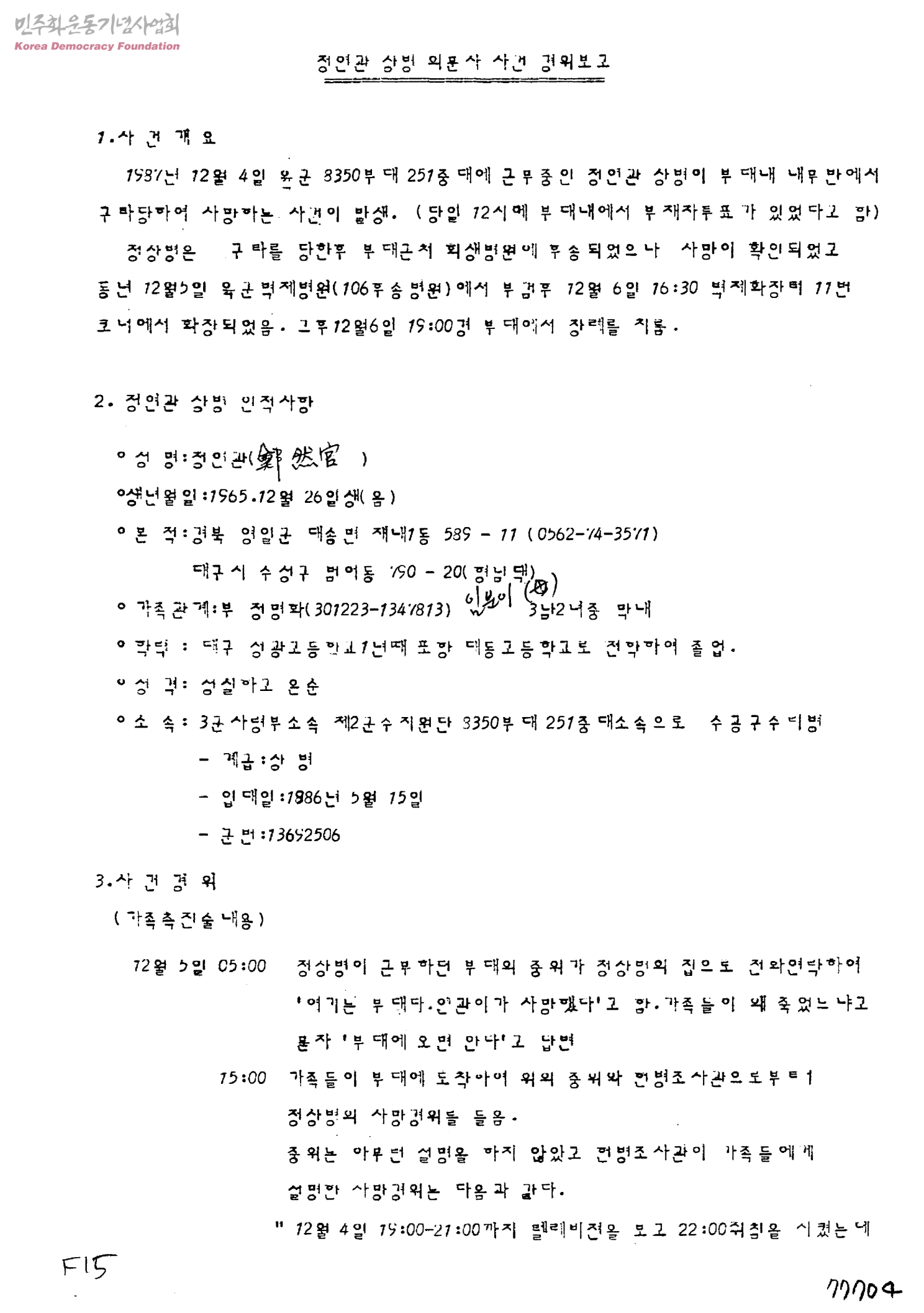 정연관 상병 의문사 사건 경위보고