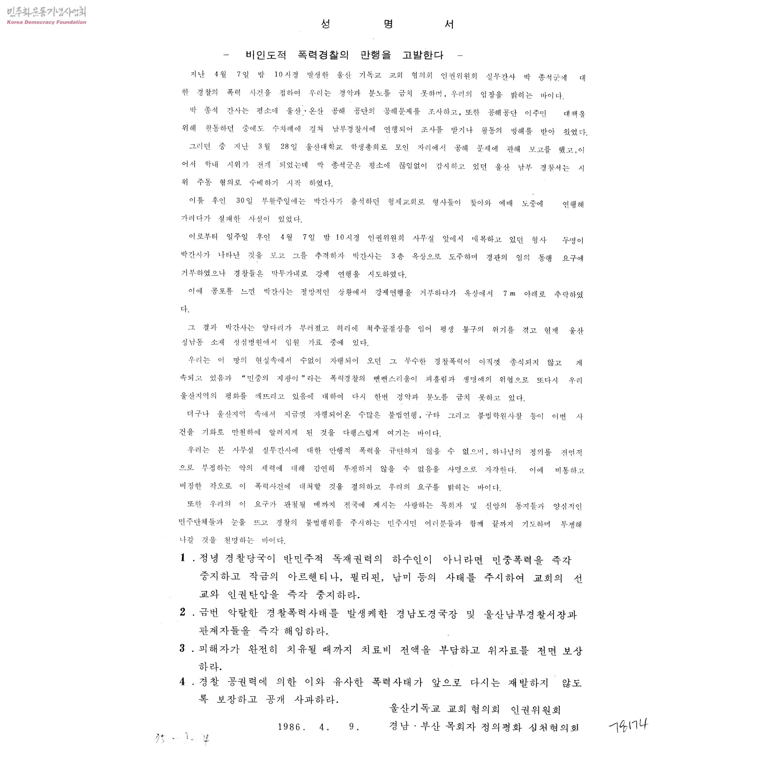 [울산기독교교회협의회인권위원회 실무간사 박종석군에 대한 비인도적 폭력경찰의 만행에 관련된 문건들]