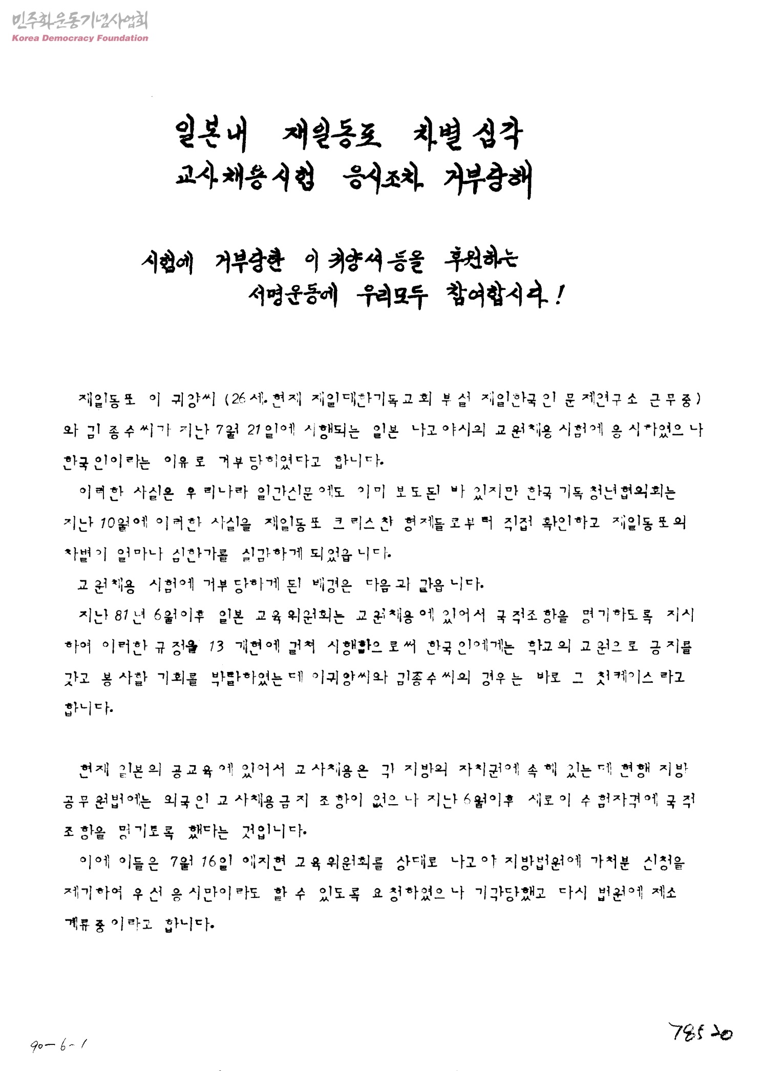 일본내 재일동포 차별 심각 교사채용시험 응시조차 거부당해-시험에 거부당한 이 귀양씨등을 후원하는 서명운동에 우리모두 참여합시다!