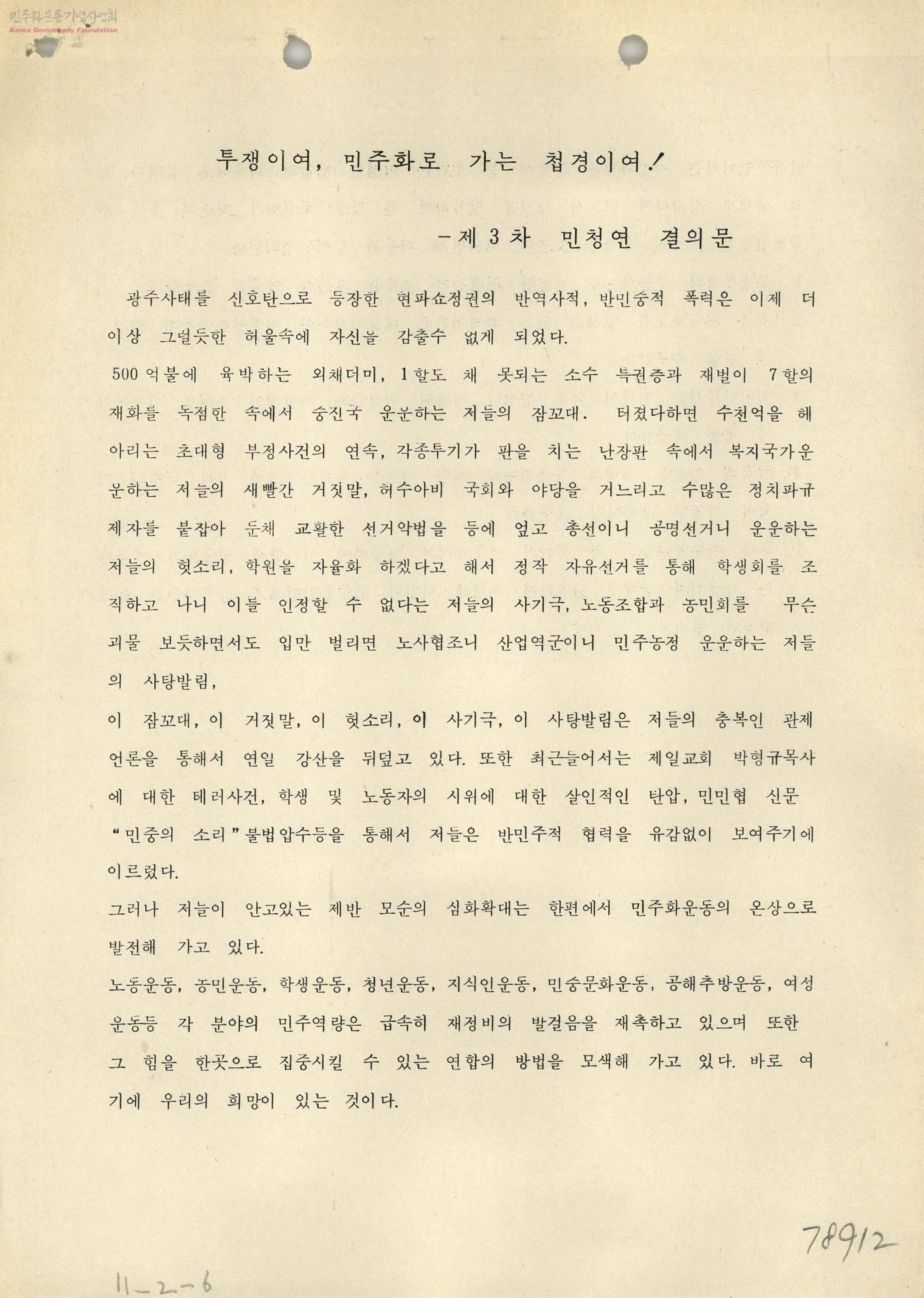 제3차 민청연 결의문[투쟁이여, 민주화로 가는 첩경이여!]