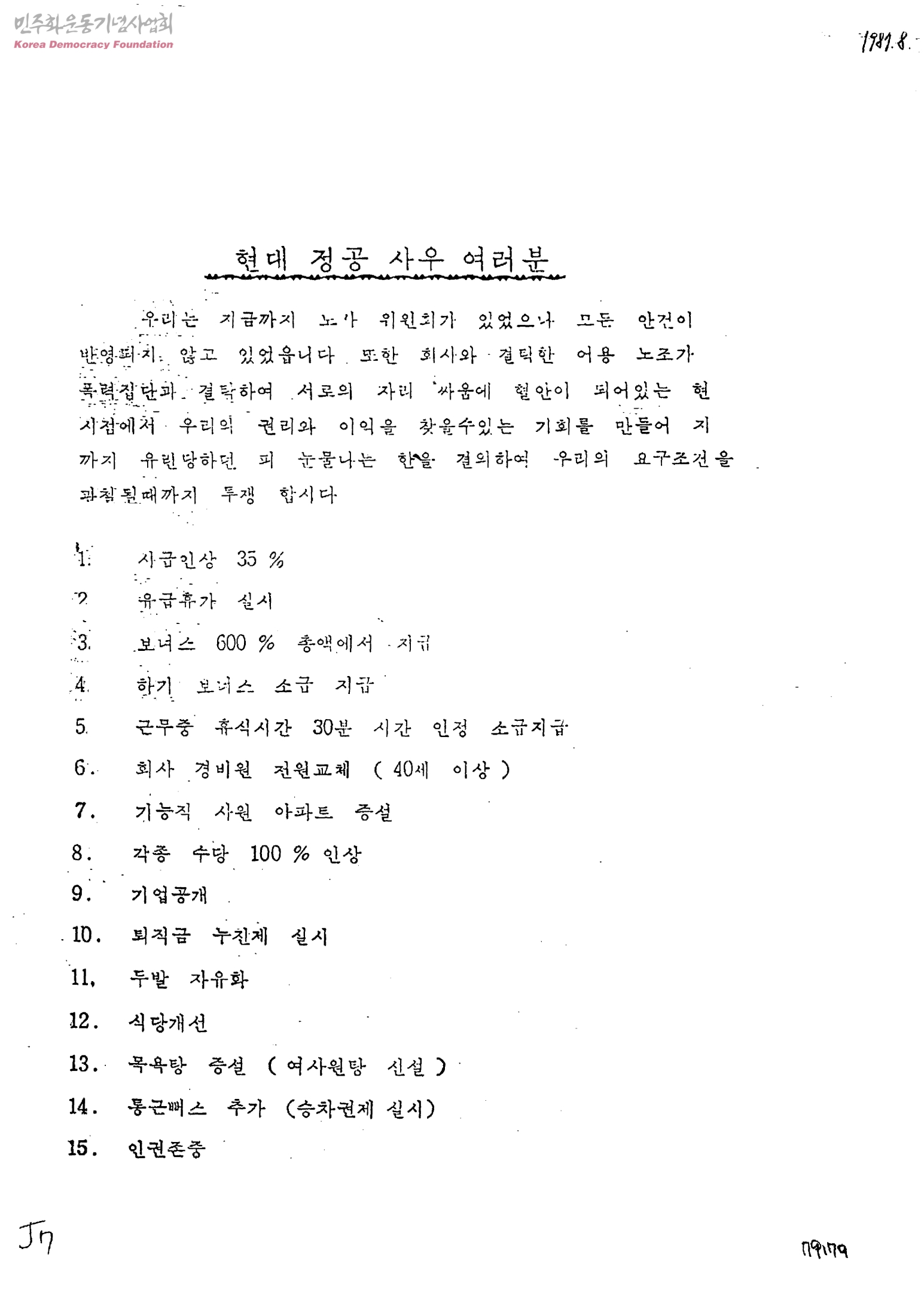 현대 정공 사우 여러분[현대 정공 근로자의 투쟁 관련]