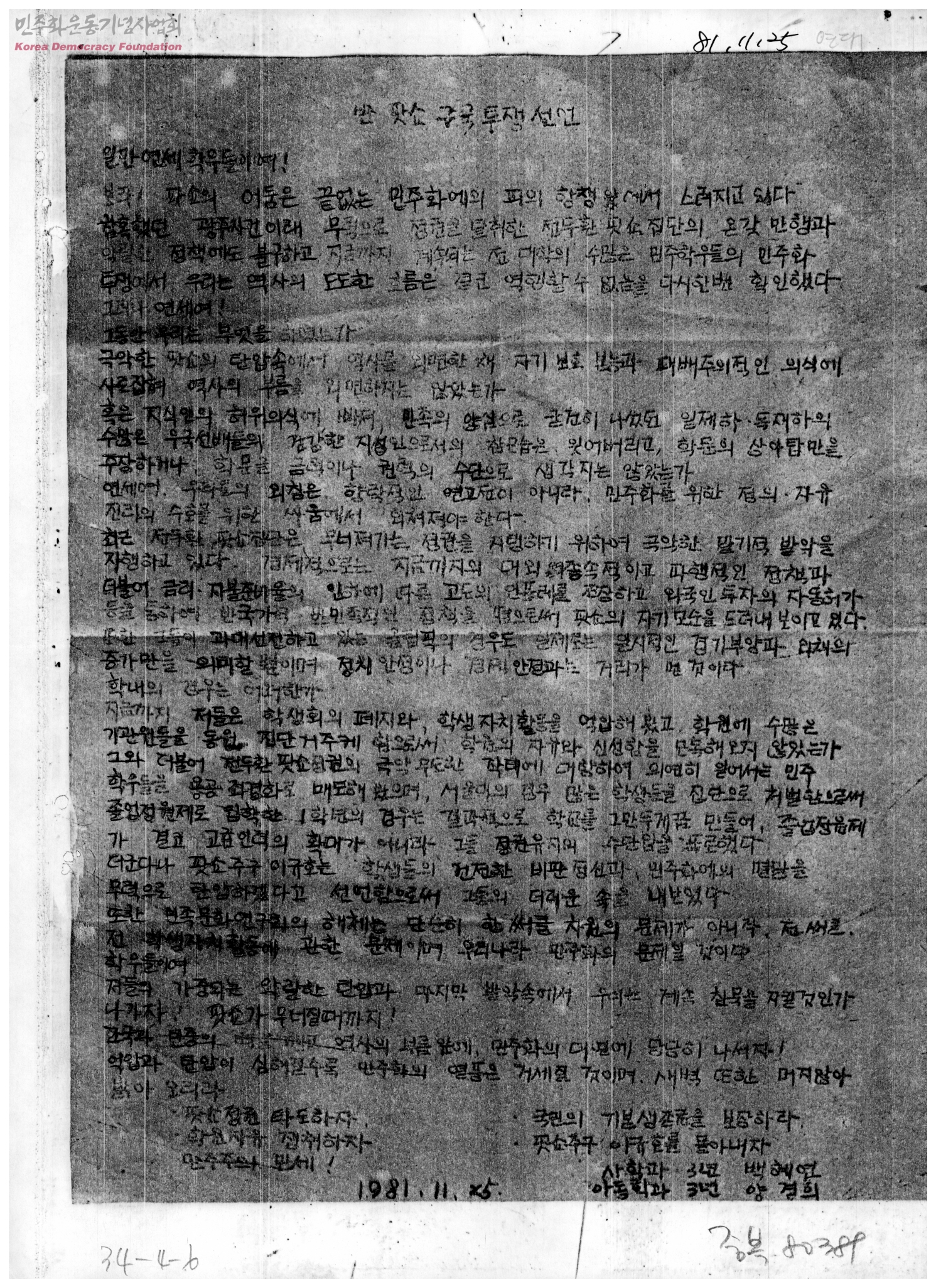 - 생산자 및 기증자가 ‘경향신문사’인 사진의 사용은 경향신문사 담당자(02-3701-1635)를 통해 구매하실 수 있습니다. 그 외의 생산자 및 기증자는 민주화운동기념사업회 사료관 담당자( hyunchaek@kdemo.or.kr / 02-6440-8961 )에게 문의바랍니다.