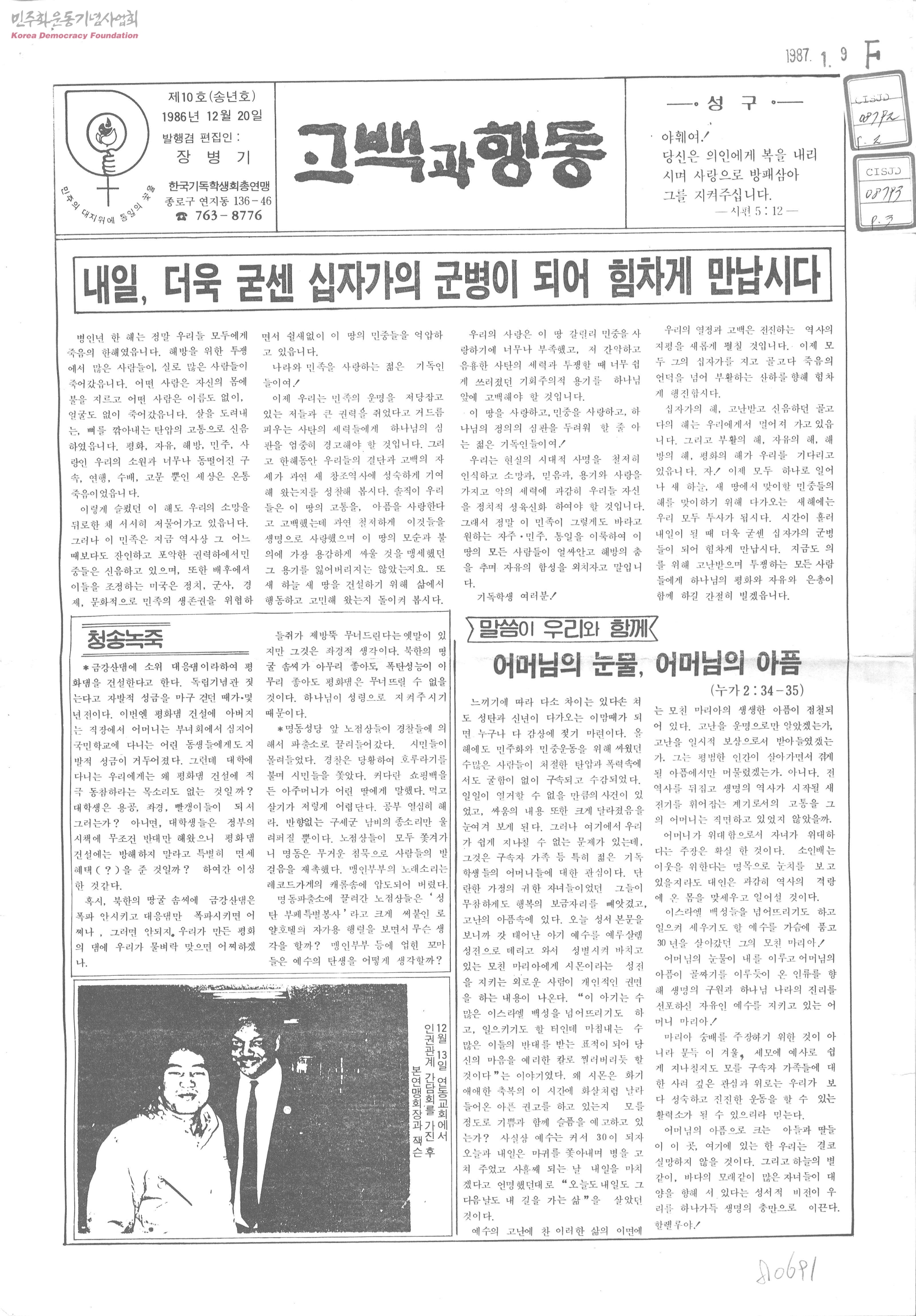 - 내일, 더욱 굳센 십자가의 군병이 되어 힘차게 만납시다 86년 주요사건 일지 특집 인권회복과 민주사회 외신 한국에 시한폭탄이 짹깍거리고 있다 고 김세진열사 추모집제작관련 조영식간사 징역 1년선고