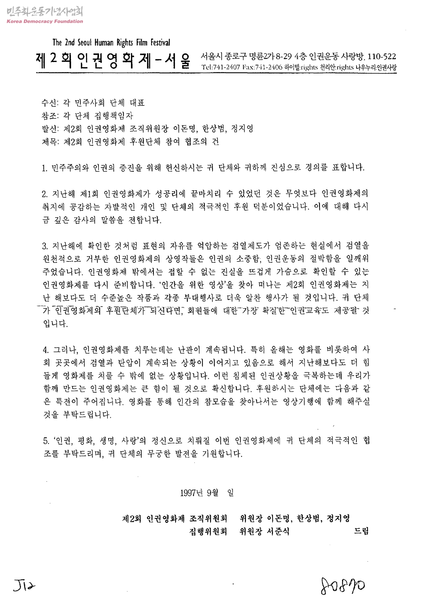 제2회 인권영화제 후원단체 참여 협조의 건[수신:각 민주사회 단체 대표, 발신:제2회 인권영화제 조직위원장 이돈명, 한상범, 정지영]