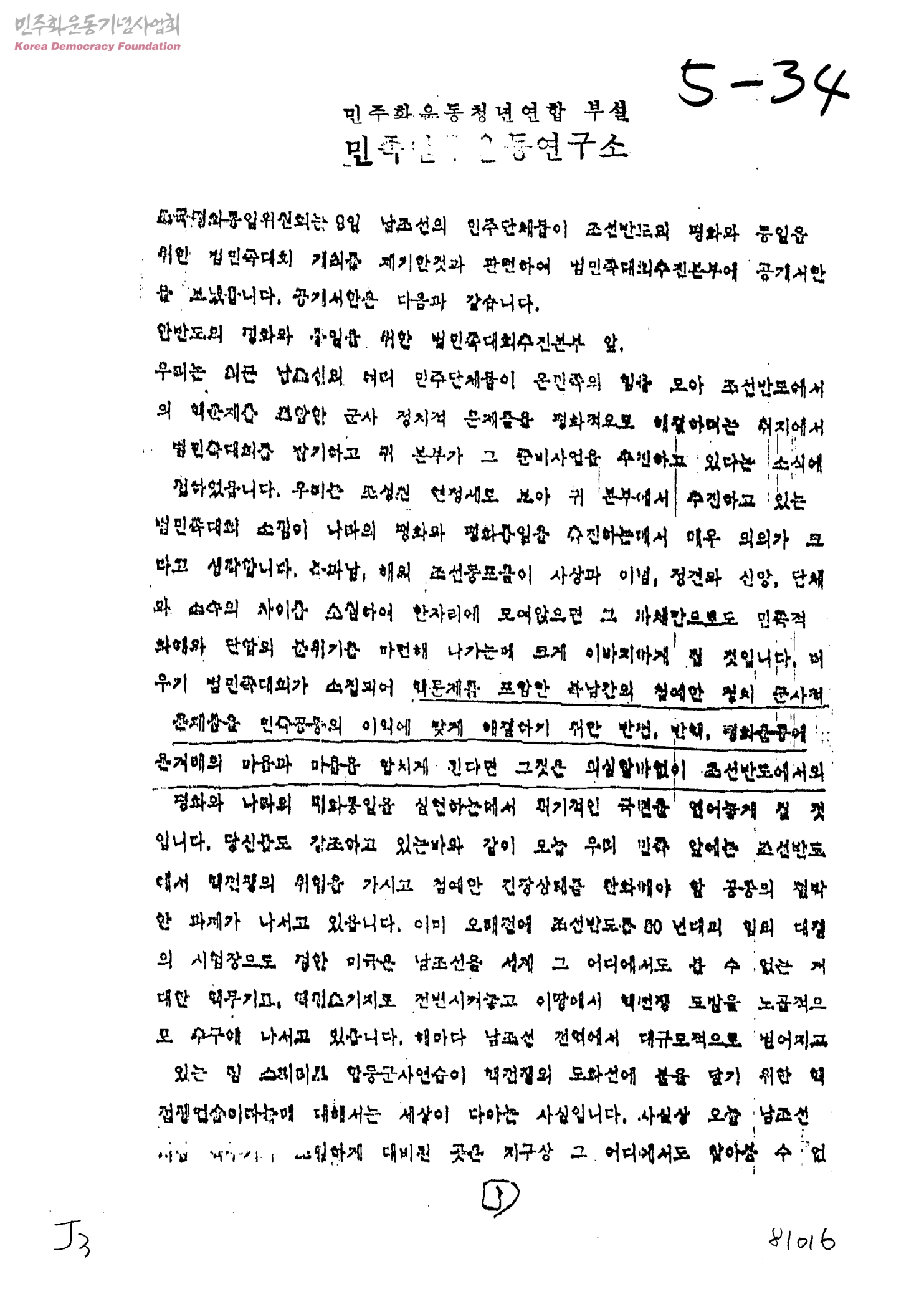 [북측의 조국평화통일위원회가 남측 민주단체들에게 보내는 한반도의 평화와 통일을 위한 범민족대회 개최 관련 답신]