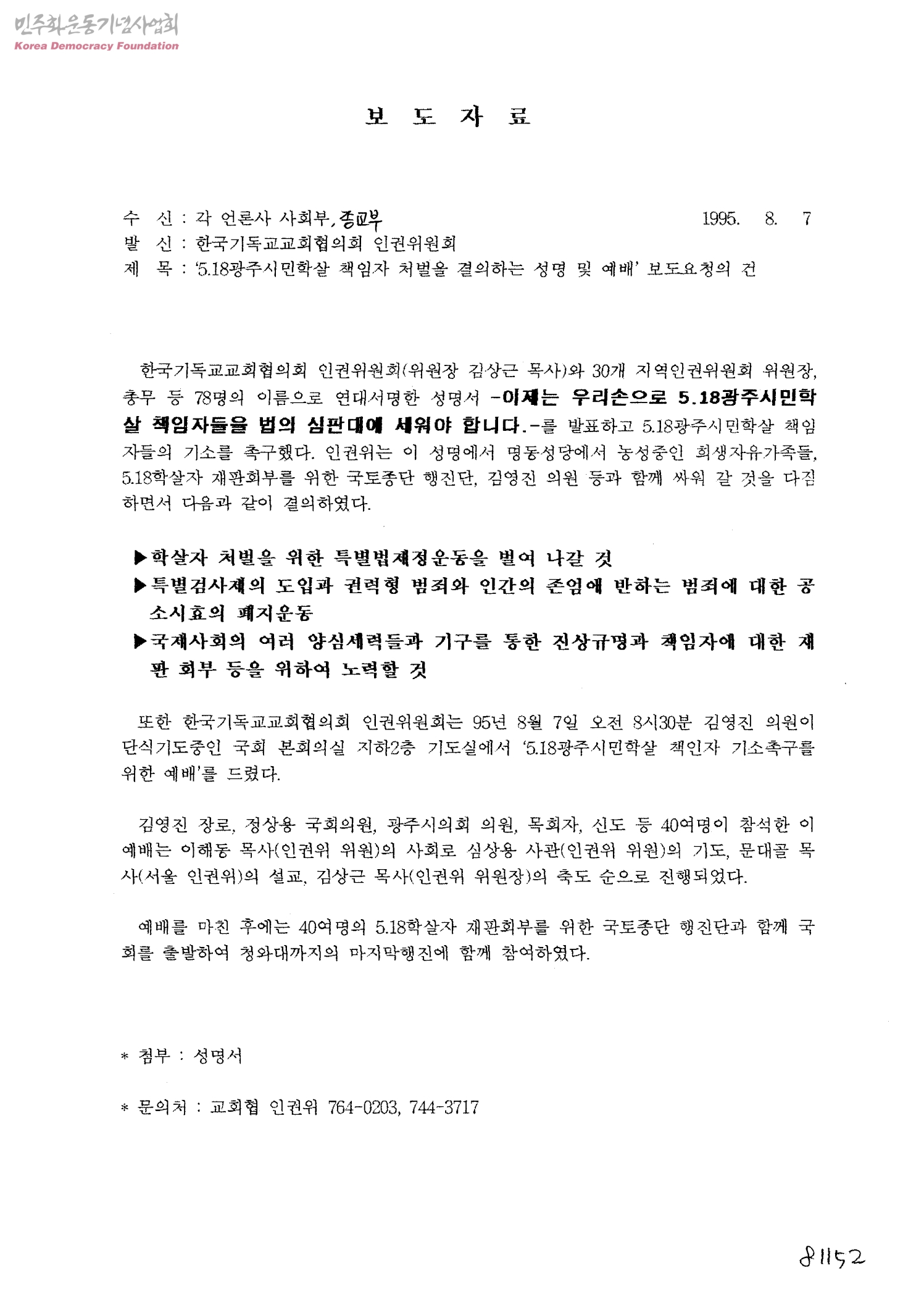 보도자료-'5.18광주시민학살 책임자 처벌을 결의하는 성명 및 예배' 보도요청의 건[수신:각 언론사 사회부,종교부, 발신:한국기독교교회협의회 인권위원회]