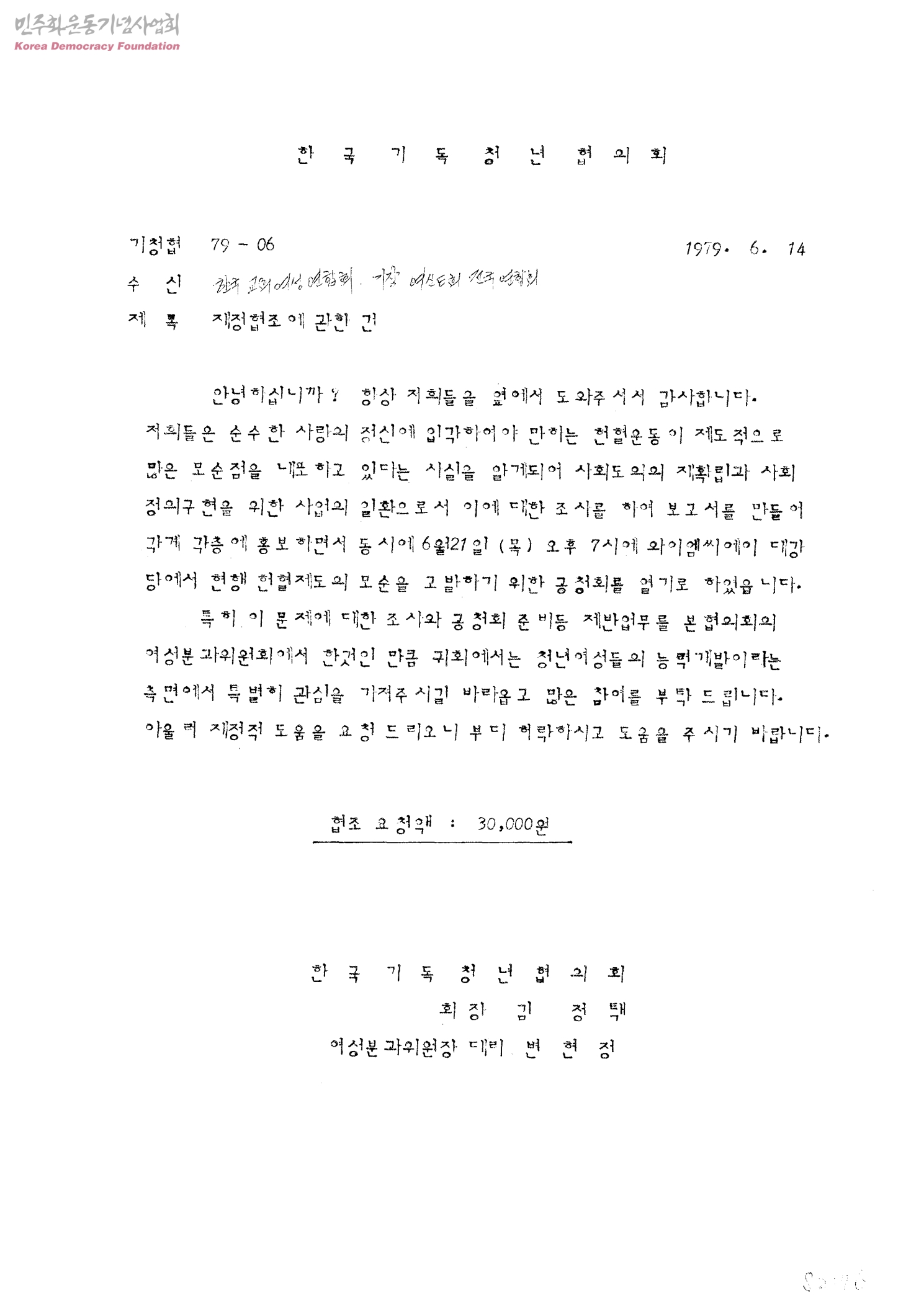 재정협조에 관한 건[수신:한국교회여성연합회, 기장여신도회전국연합회]