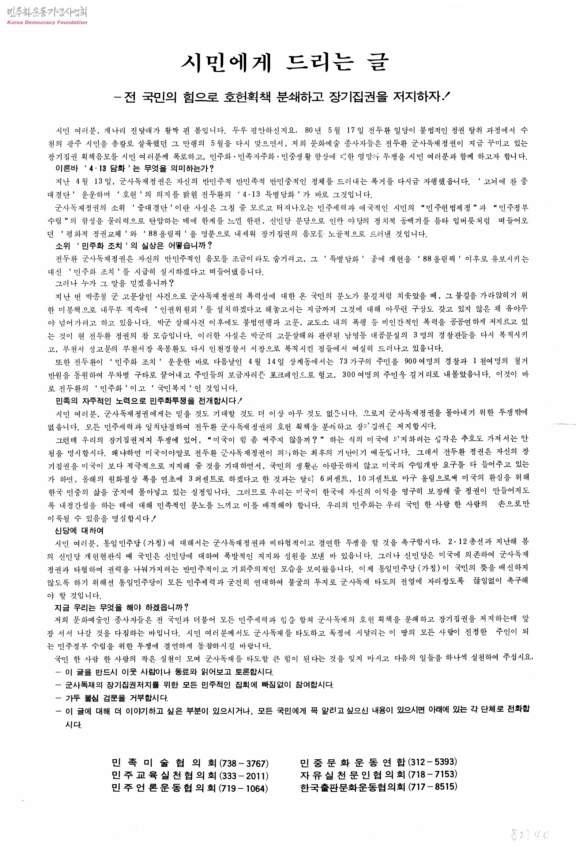 시민에게 드리는 글_ 전 국민의 힘으로 호헌획책 분쇄하고 장기집권 저지하자