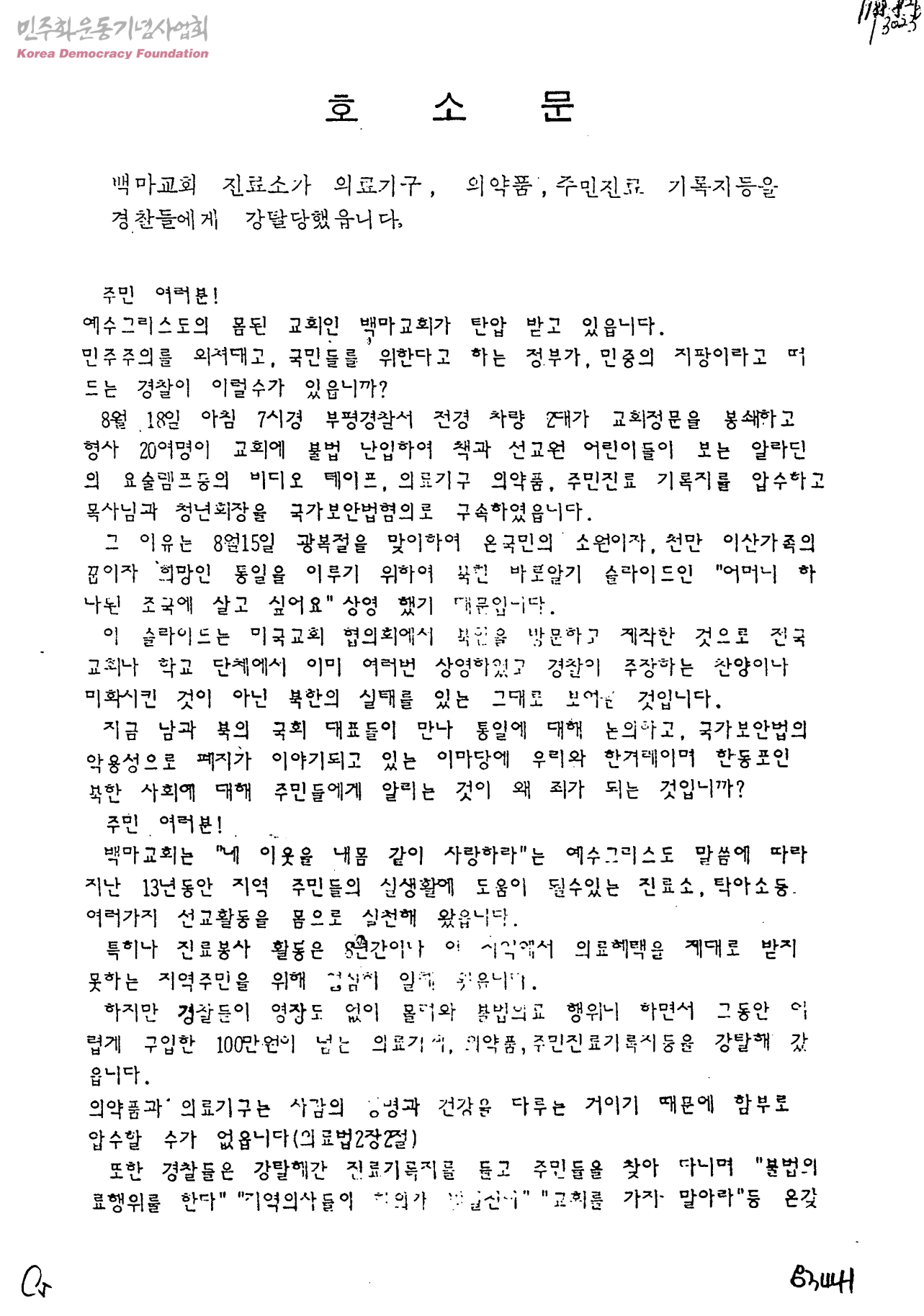 백마교회 진료소에 대한 호소문/경위서
