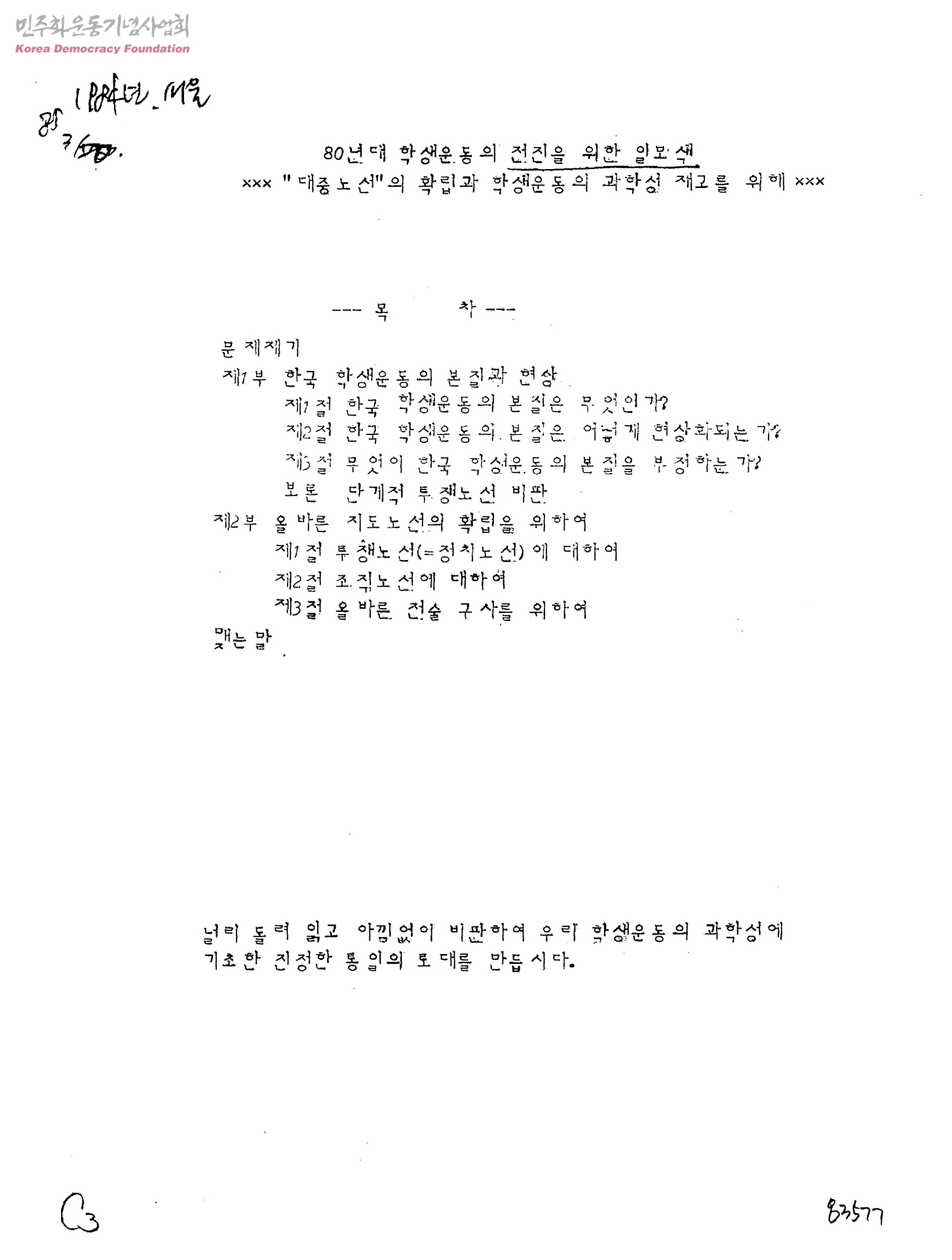 80년대 학생운동의 전진을 위한 일모색-대중노선의 확립과 학생운동의 과학성 재고를 위해