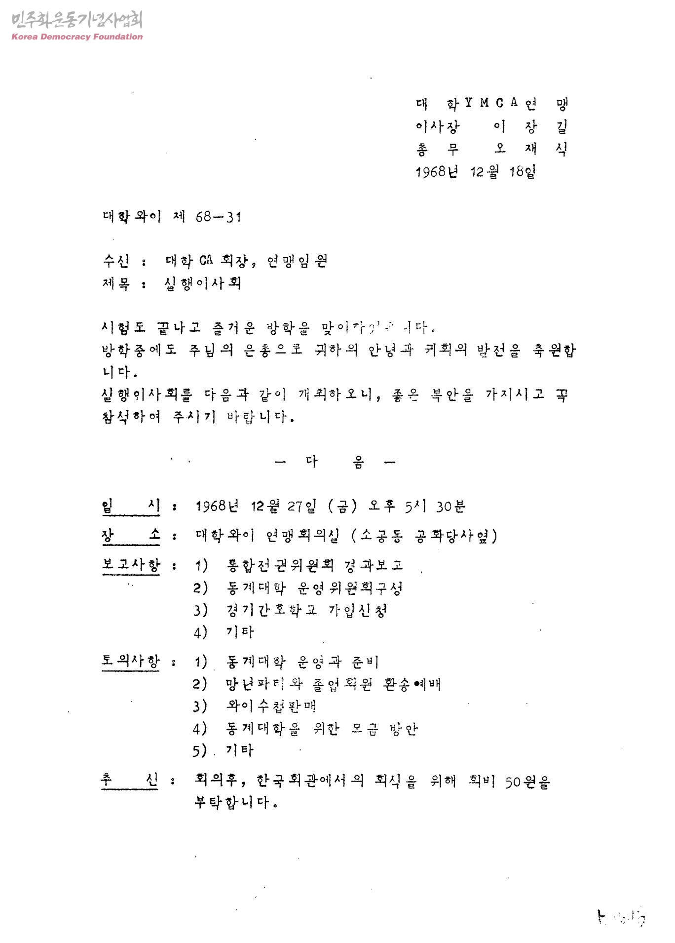 실행이사회[수신:대학 CA 회장, 연맹임원, 발신:대학YMCA연맹]