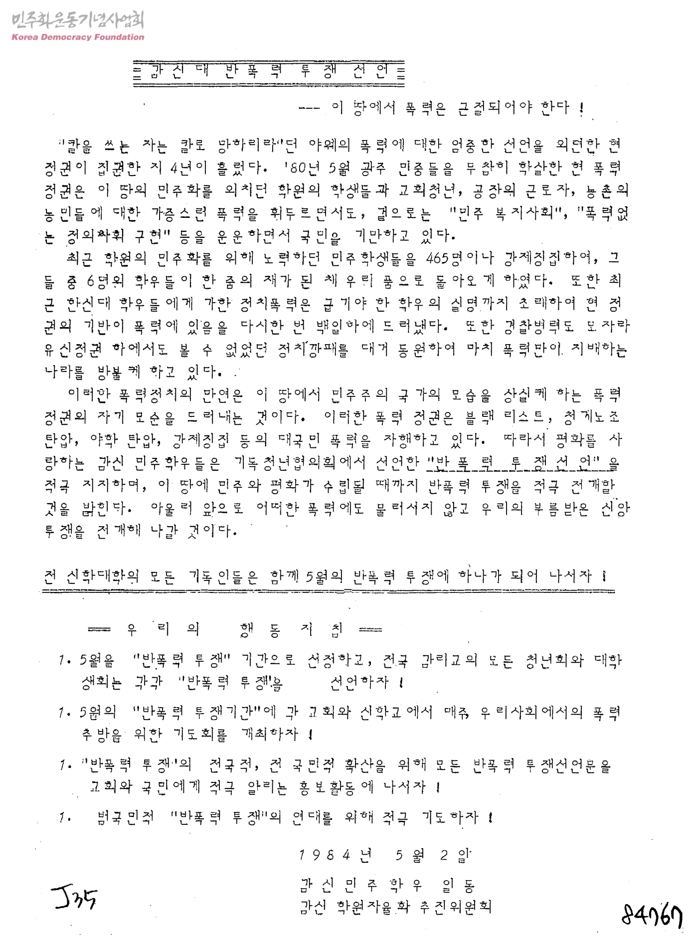 감신대 반폭력 투쟁 선언-이 땅에서 폭력은 근절되어야 한다