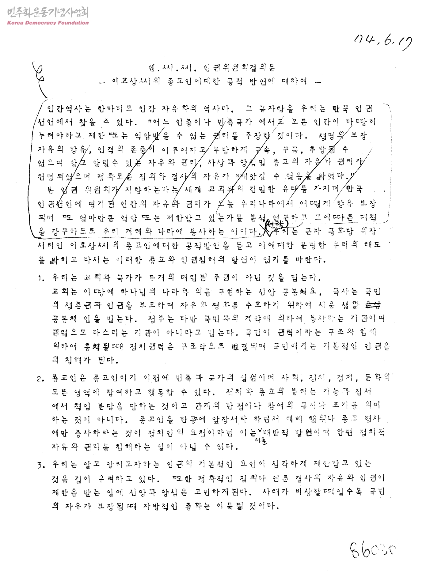 엔.씨.씨. 인권위원회결의문-이효상씨의 종교인에대한 공적발언에 대하여