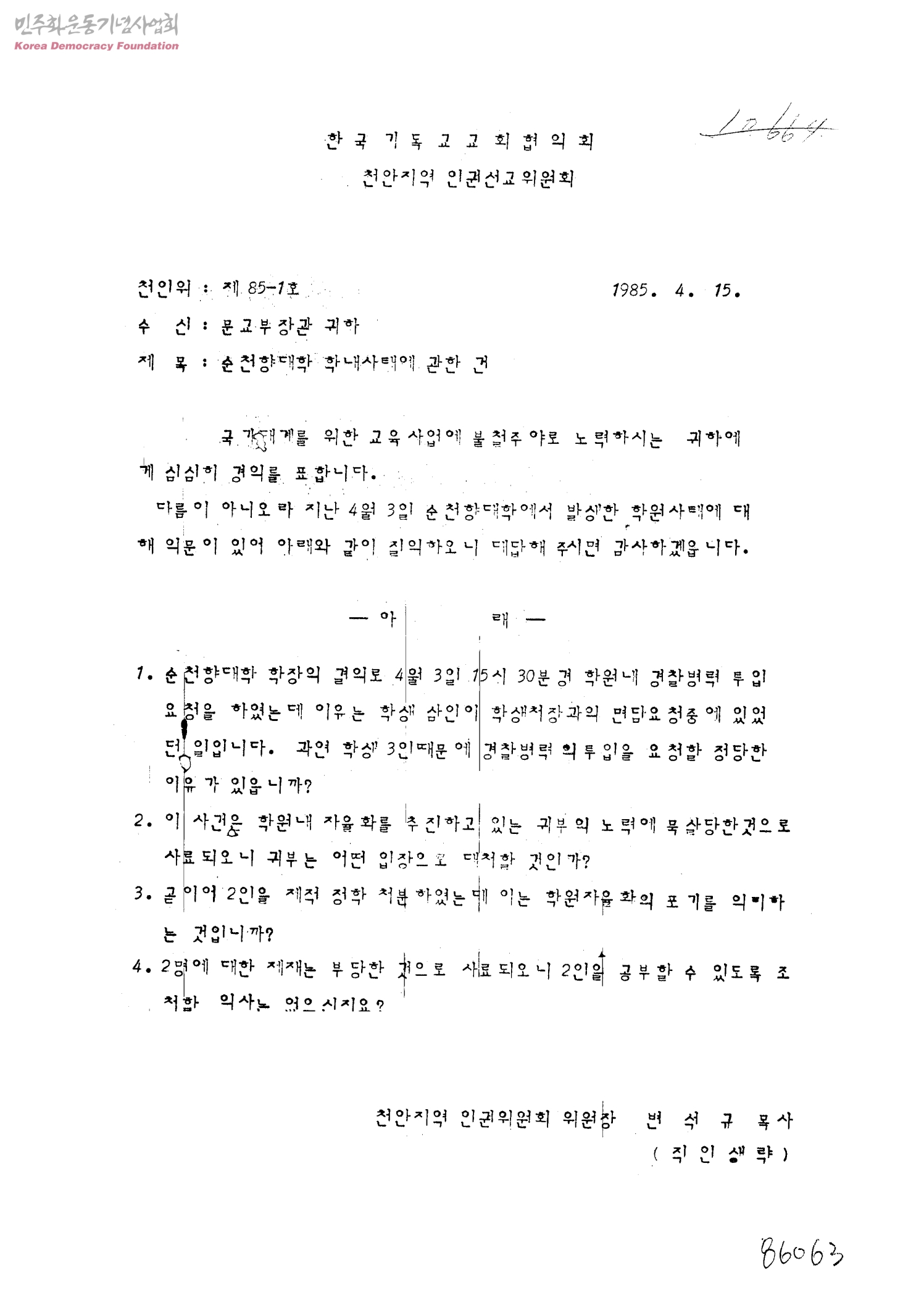 순천향대학 학내사태에 관한 건[수신:문교부장관]