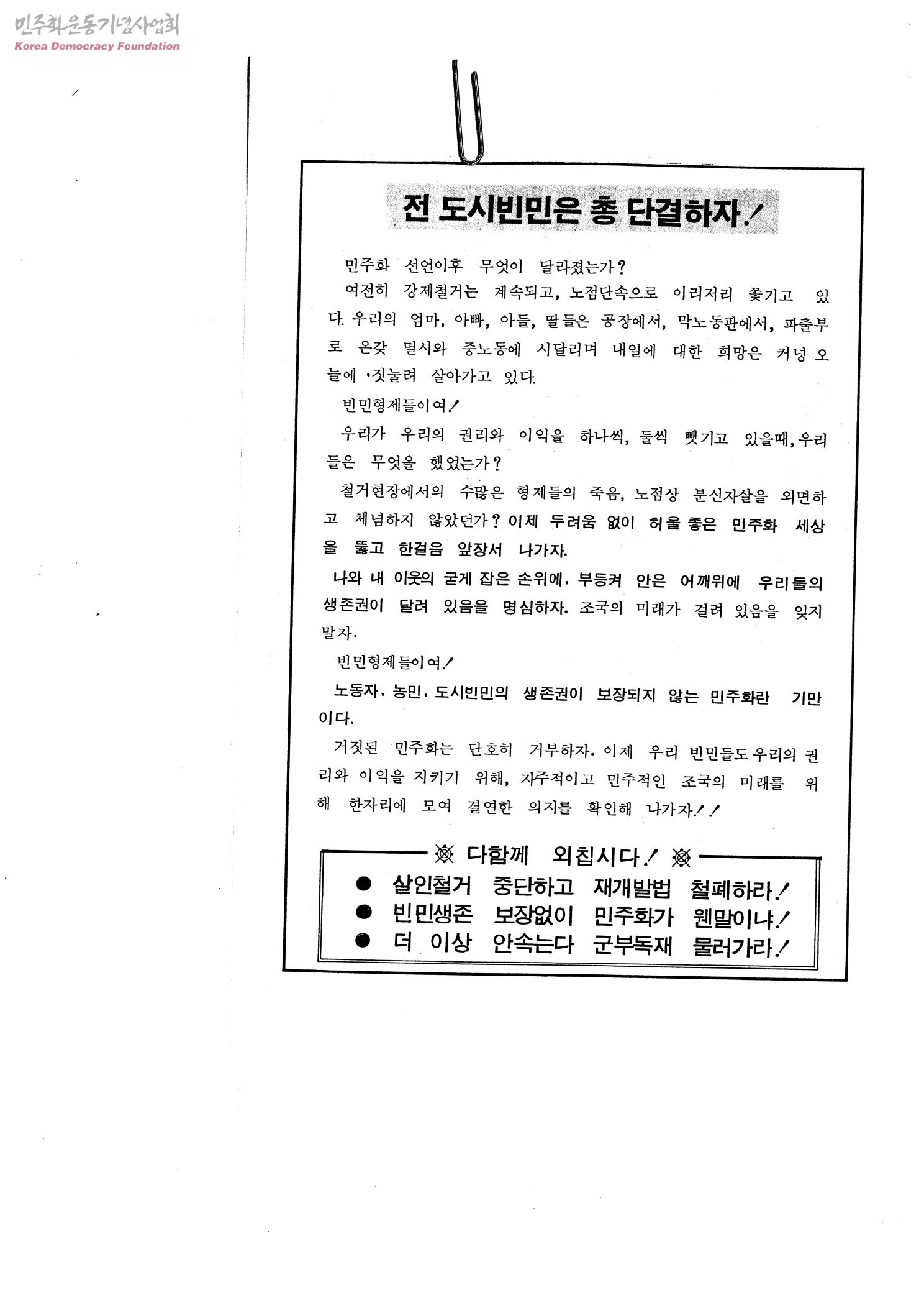 - 살인철거 중단하고 재개발법 철폐하며, 빈민생존 보장없이 민주화를 이루려 하지 말고 군부독재의 퇴진을 주장함