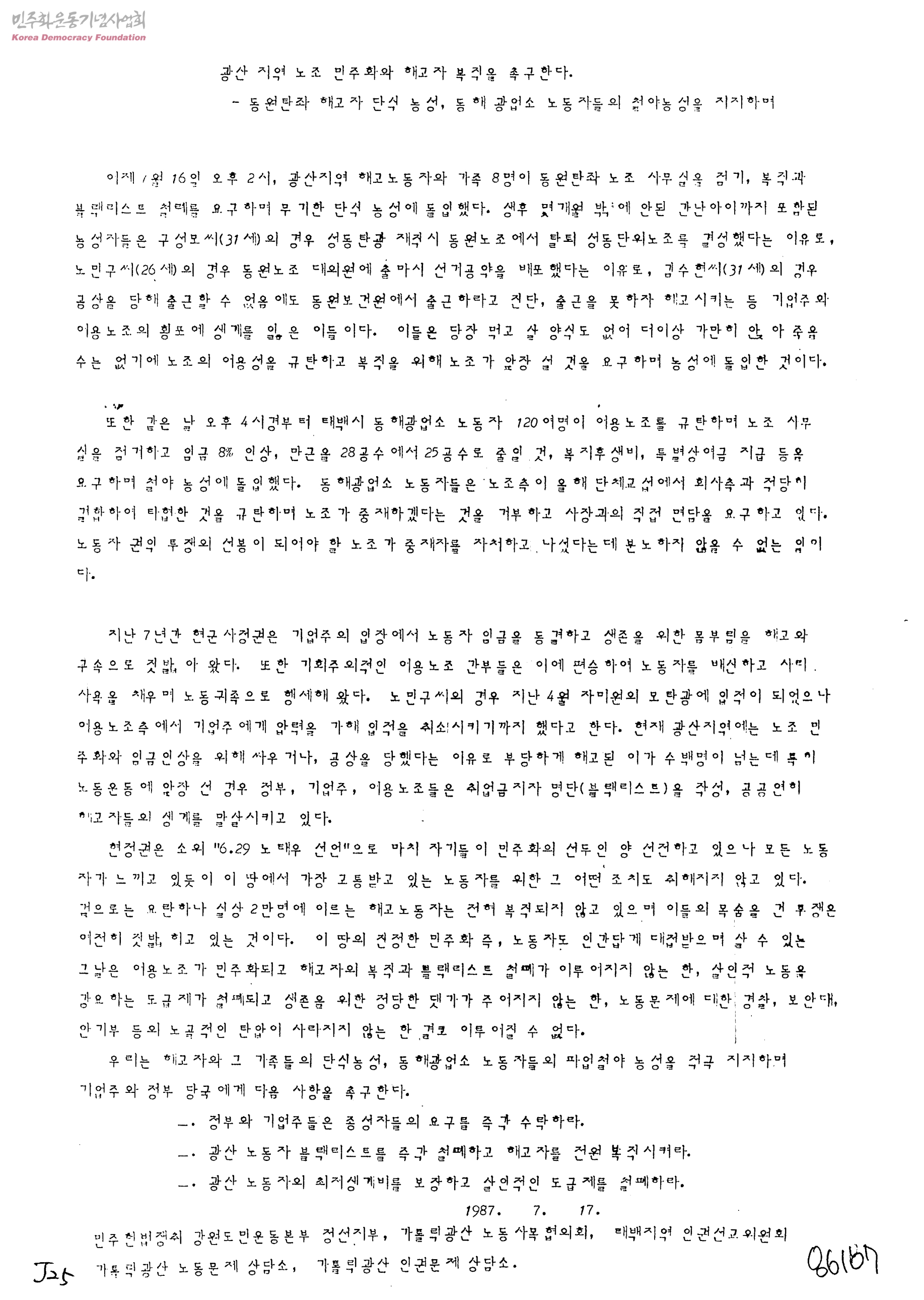 광산 지역 노조 민주화와 해고자 복직을 촉구한다
