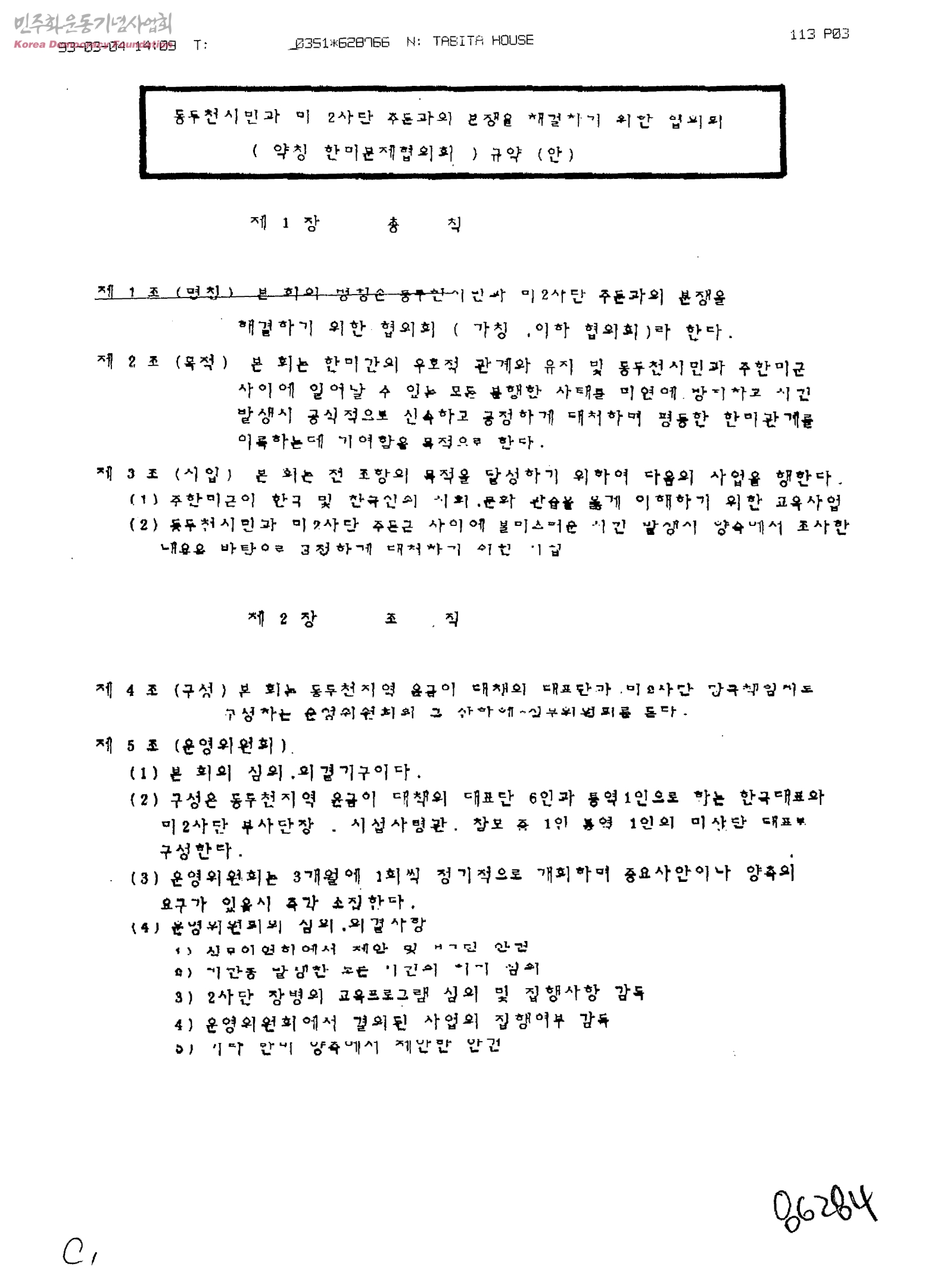 동두천시민과 미2사단 주둔과의 본쟁을 해결하기 위한 협의의(약칭 한미문제협의회)규약 (안)
