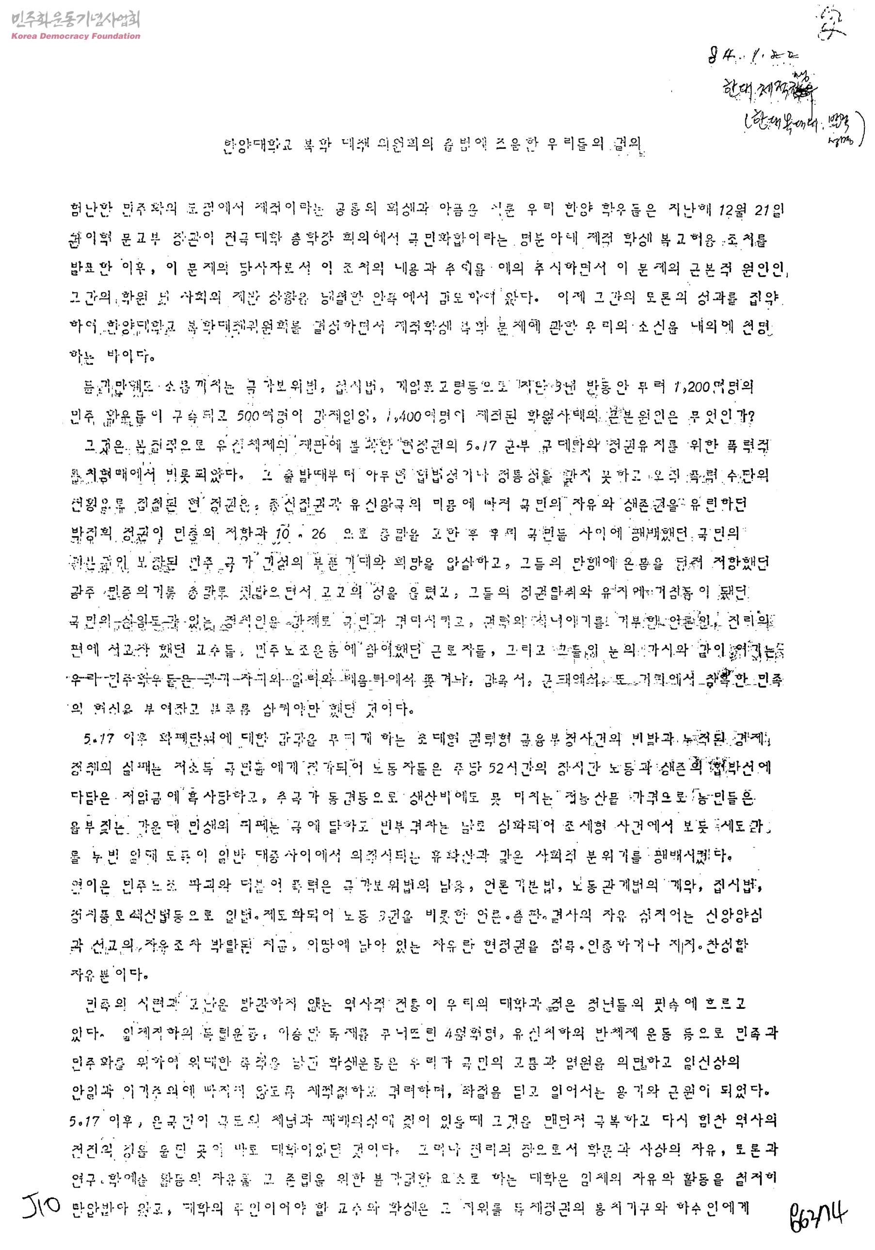 한양대학교 복학 대책위원회의 출범에 즈음한 우리들의 결의