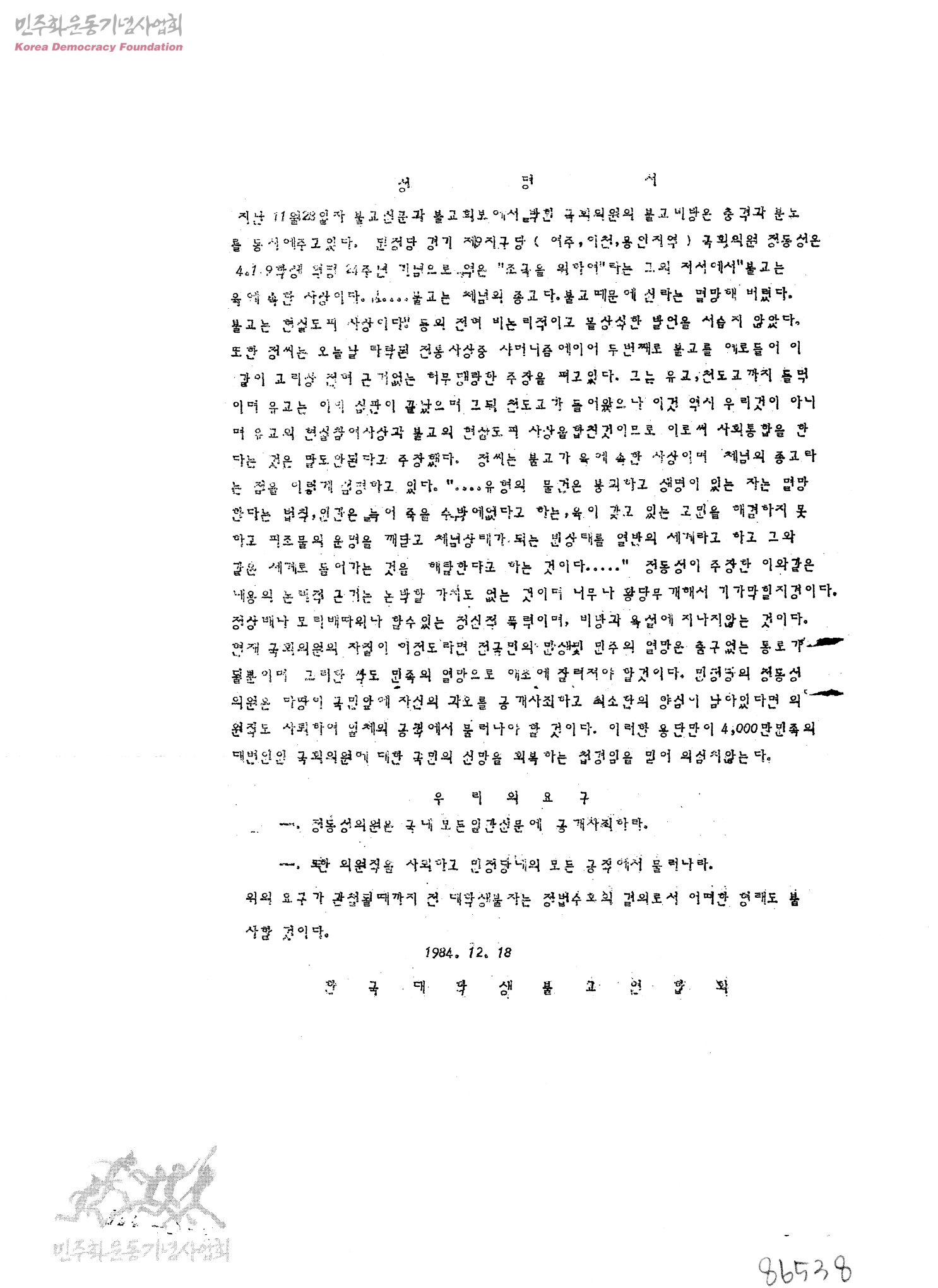 - 생산자 및 기증자가 ‘박용수’인 사진의 사용은 구매신청을 클릭하여 직접 사진 구매 신청을 하실 수 있습니다. 생산자 및 기증자가 ‘경향신문사’인 사진의 사용은 경향신문사 담당자(02-3701-1635)를 통해 구매하실 수 있습니다. 그 외의 생산자 및 기증자는 민주화운동기념사업회 사료관 담당자( hyunchaek@kdemo.or.kr / 02-6440-8961 )에 문의바랍니다.