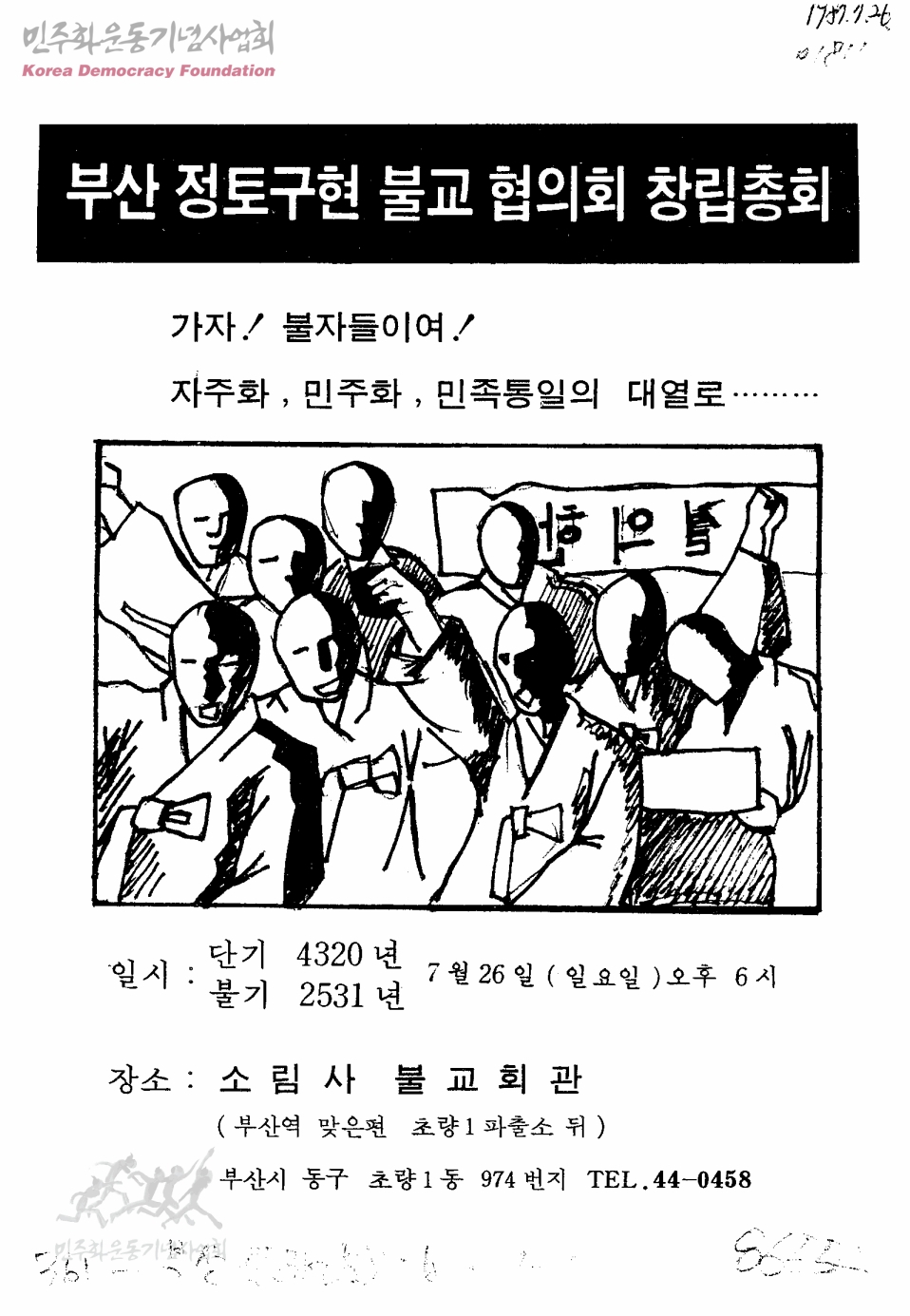 부산 정토구현 불교 협의회 창립총회-가자! 불자들이여! 자주화, 민주화, 민족통일의 대열로…….