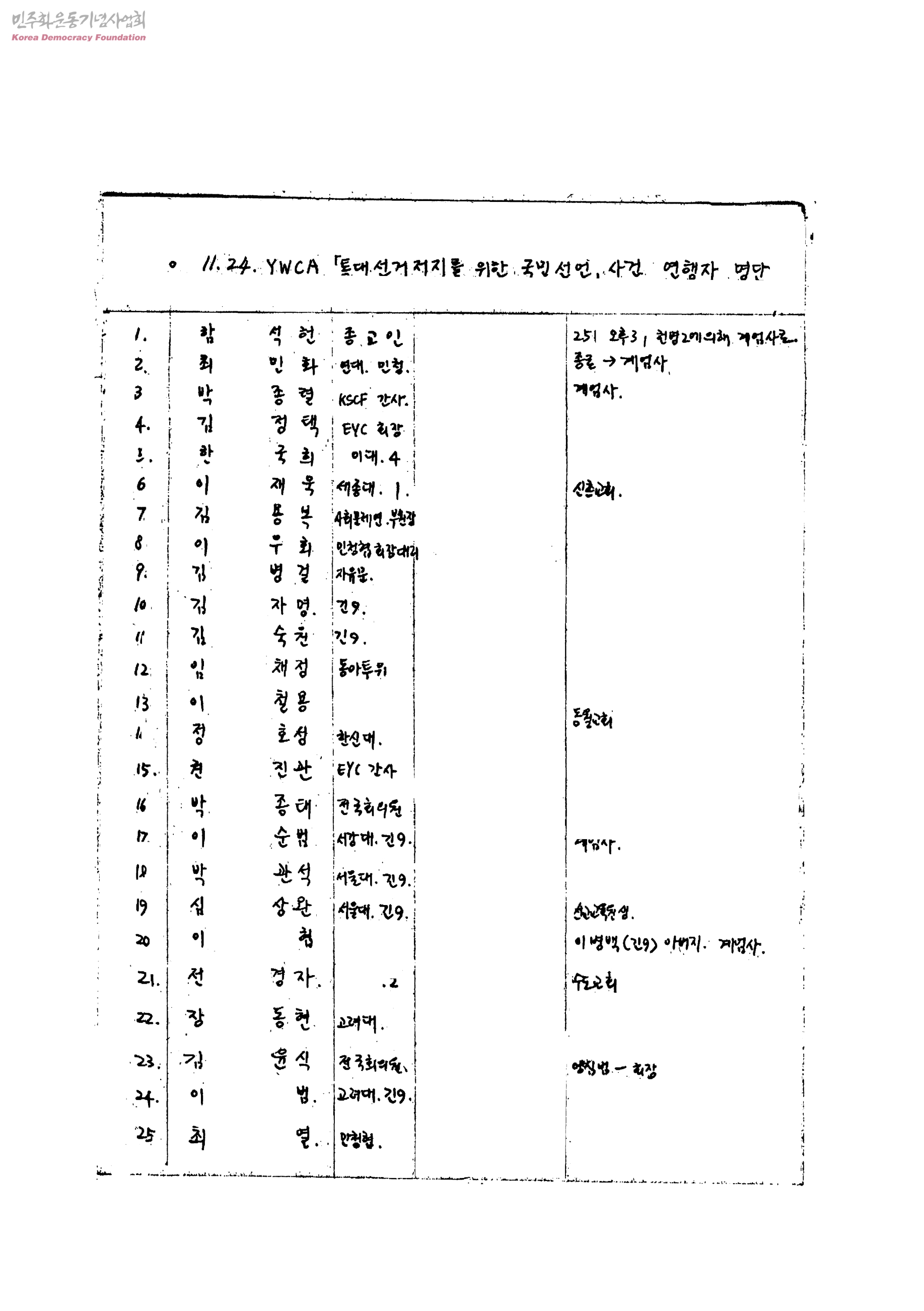 11.24 YWCA 통대선거저지를 위한 국민선언 사건 연행자 명단